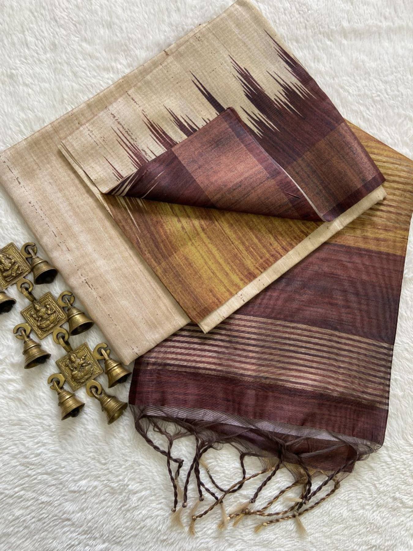 Presenting our Soft Tussar Silk Saree, designed to bring elegance and comfort together. Adorned with a beautiful print and attractive woven border, this saree radiates charm in every drape. Paired with a contrast printed blouse and finished with delicate tassels, it’s a perfect choice for festive occasions, parties, and elegant everyday wear.