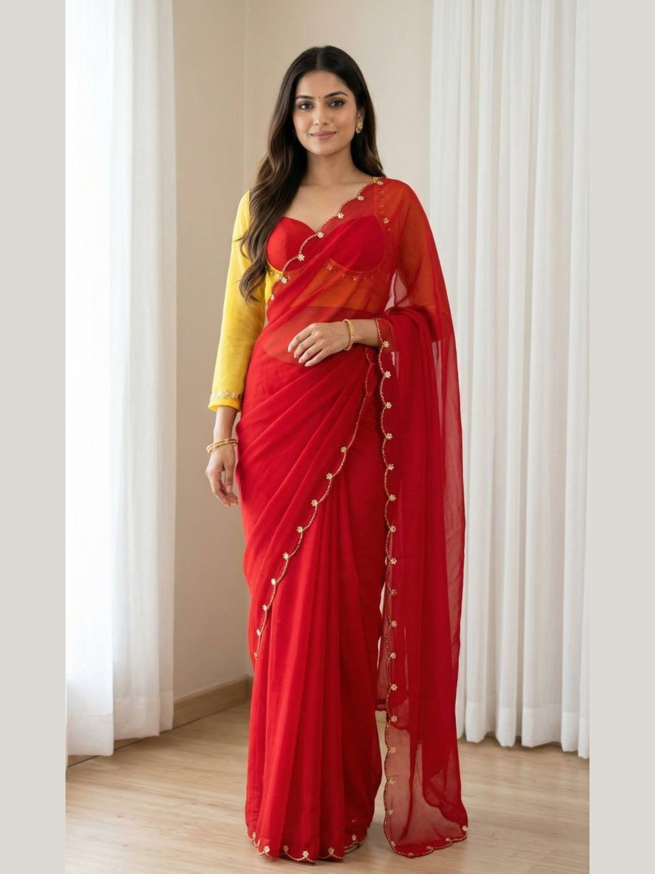 Solid Red Georgette Bollywood-Style Saree Embroidered Border And bright Yellow Blouse