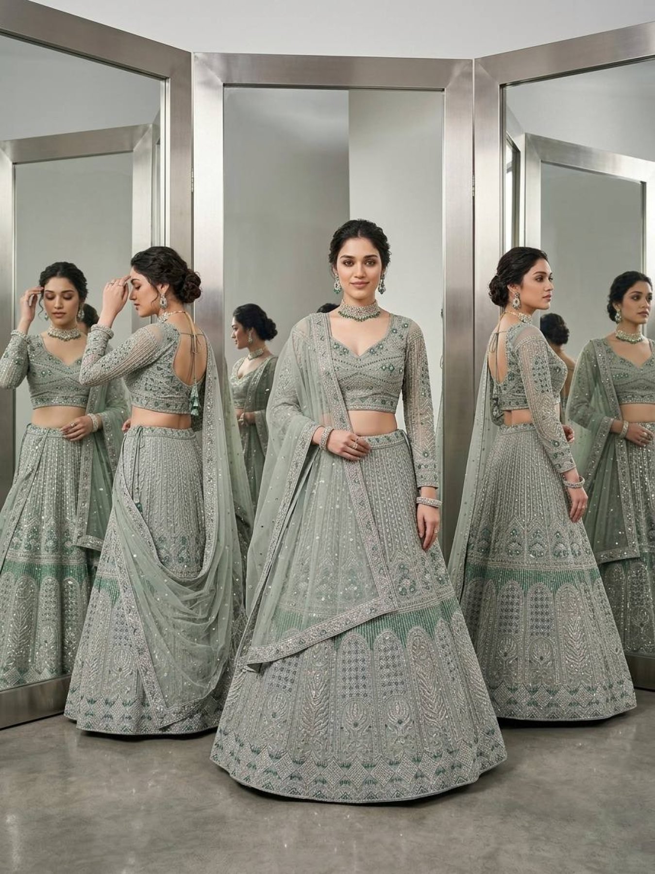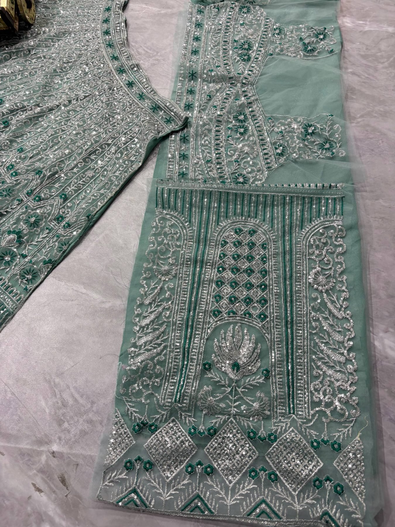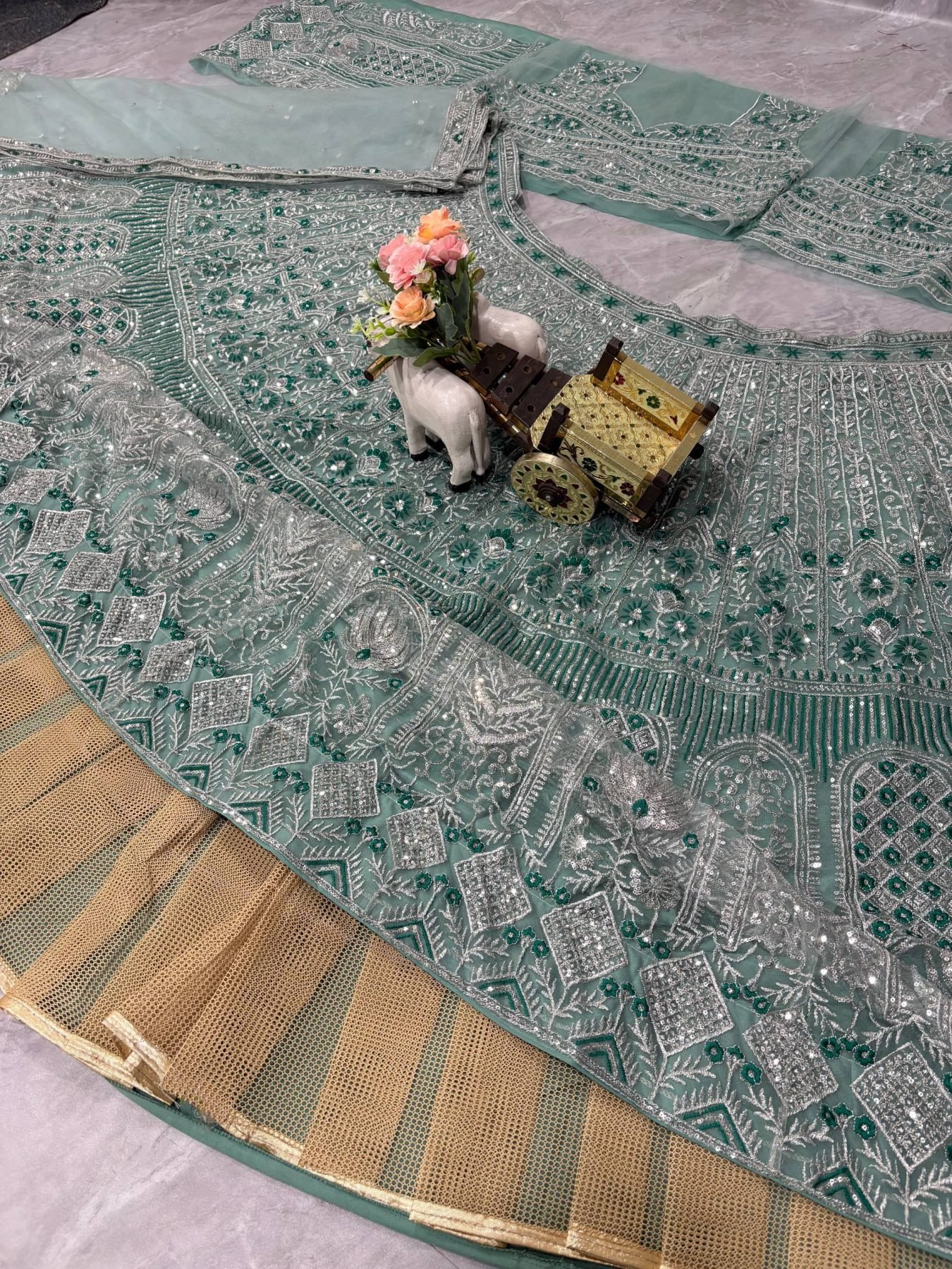 Premium soft net lehenga set featuring elegant coding sequins work with rich 4 meter flair, matching blouse, and embellished dupatta. Perfect for wedding, festive, and party wear occasions.