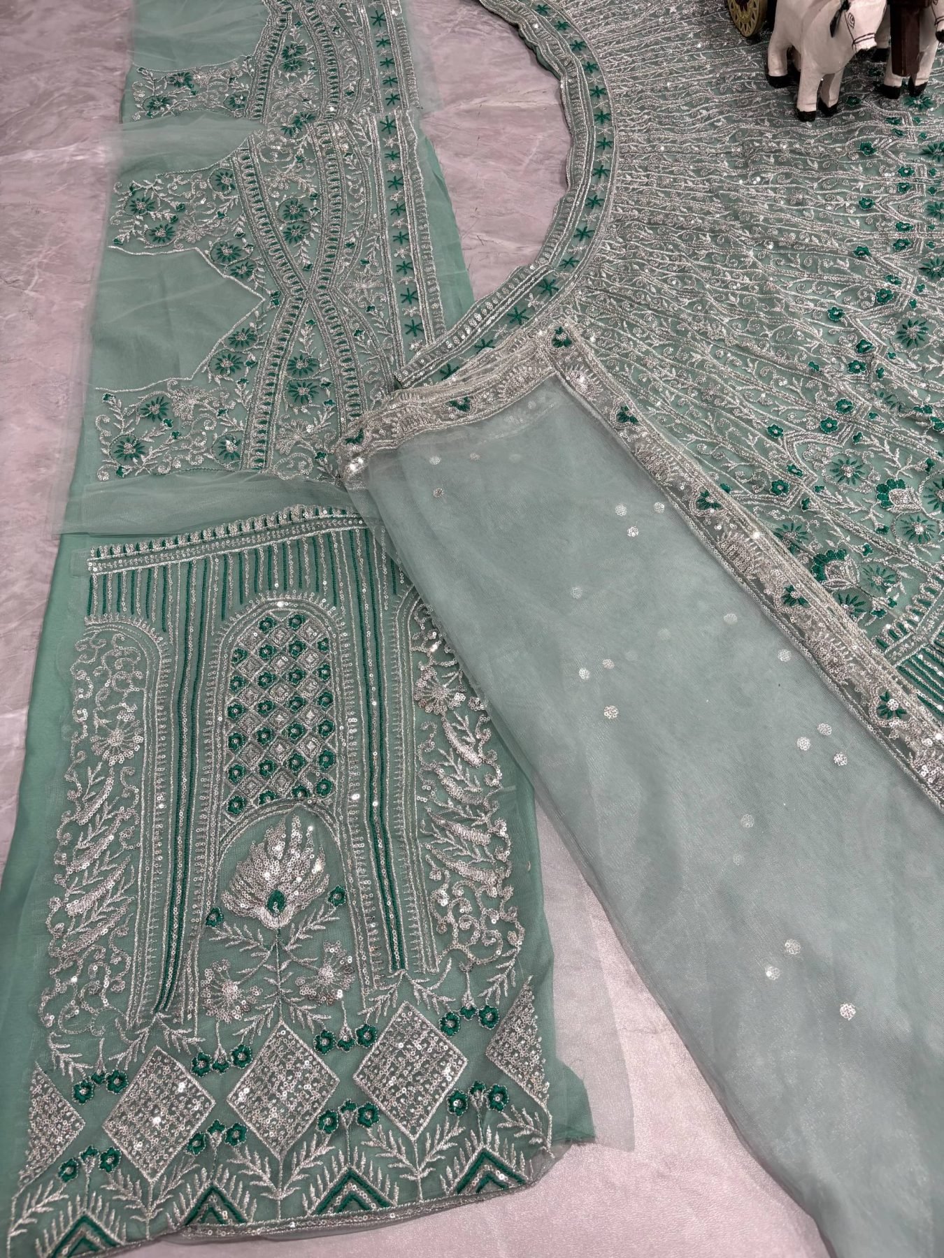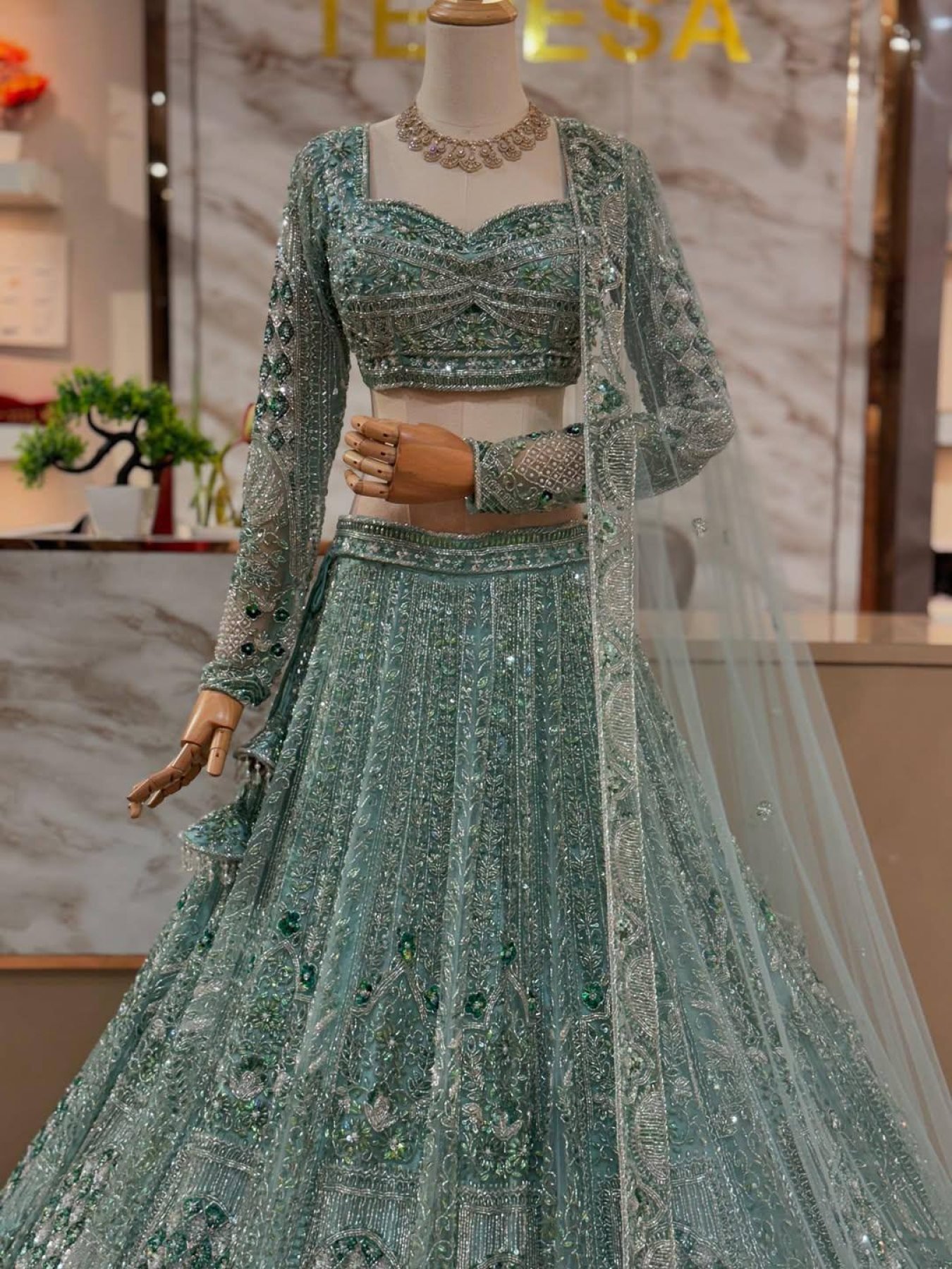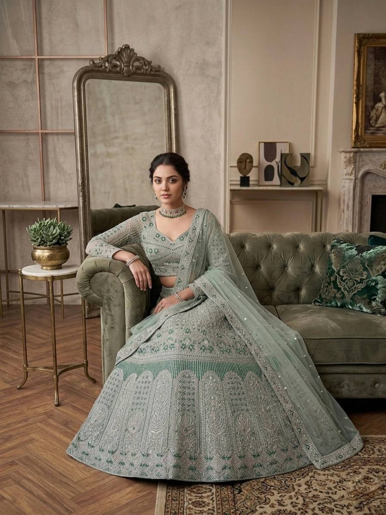 Premium soft net lehenga set featuring elegant coding sequins work with rich 4 meter flair, matching blouse, and embellished dupatta. Perfect for wedding, festive, and party wear occasions.