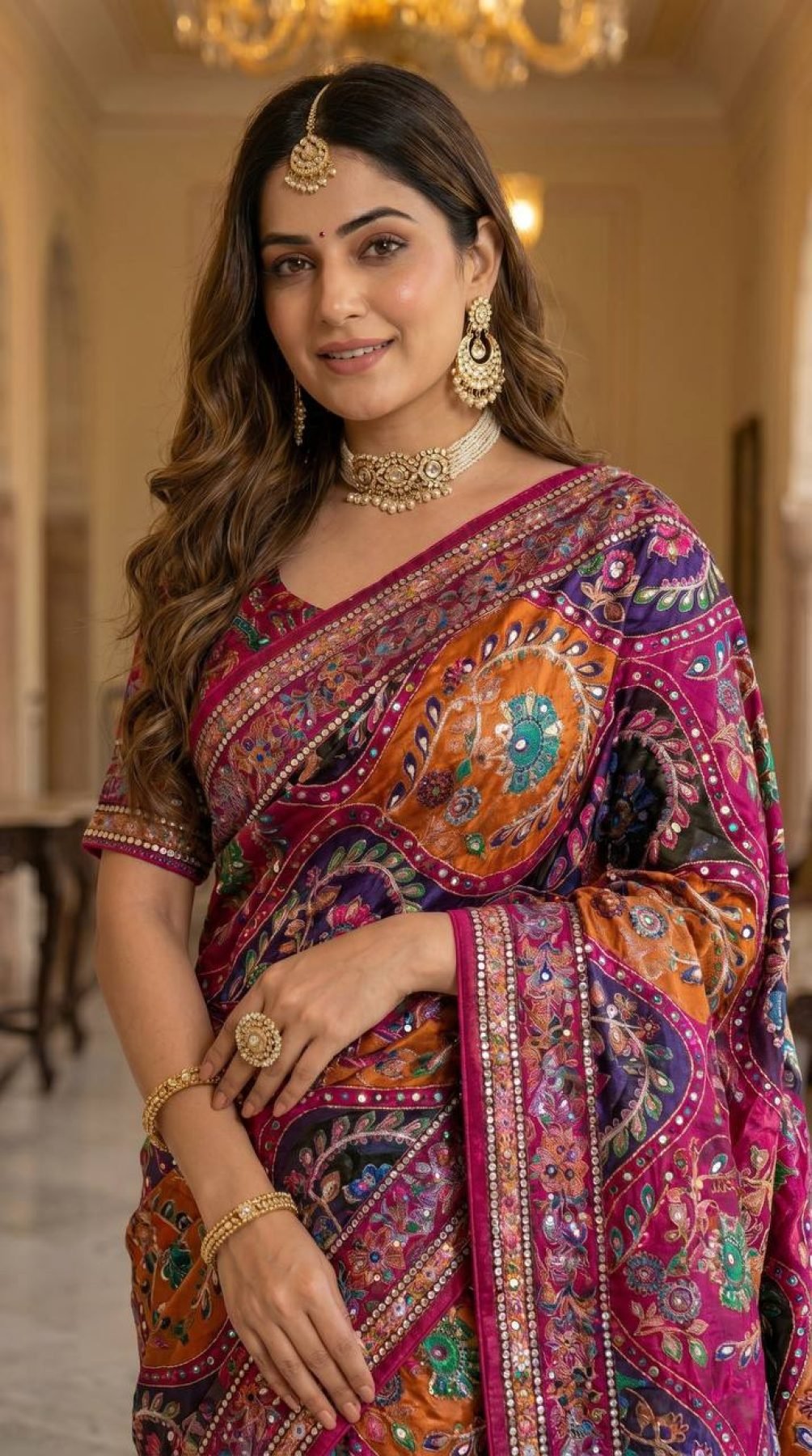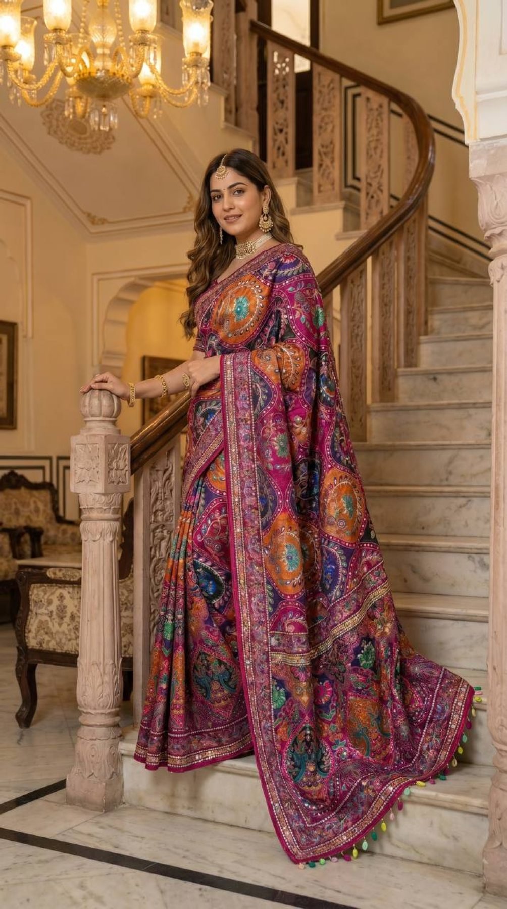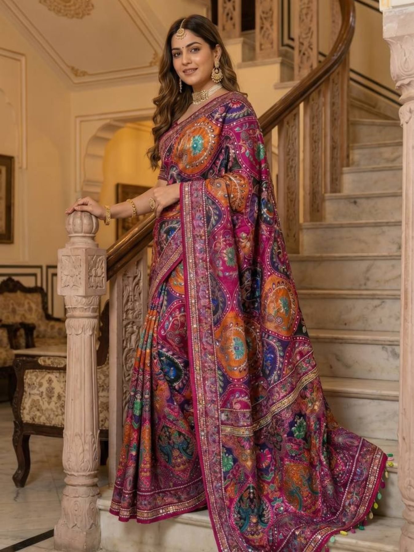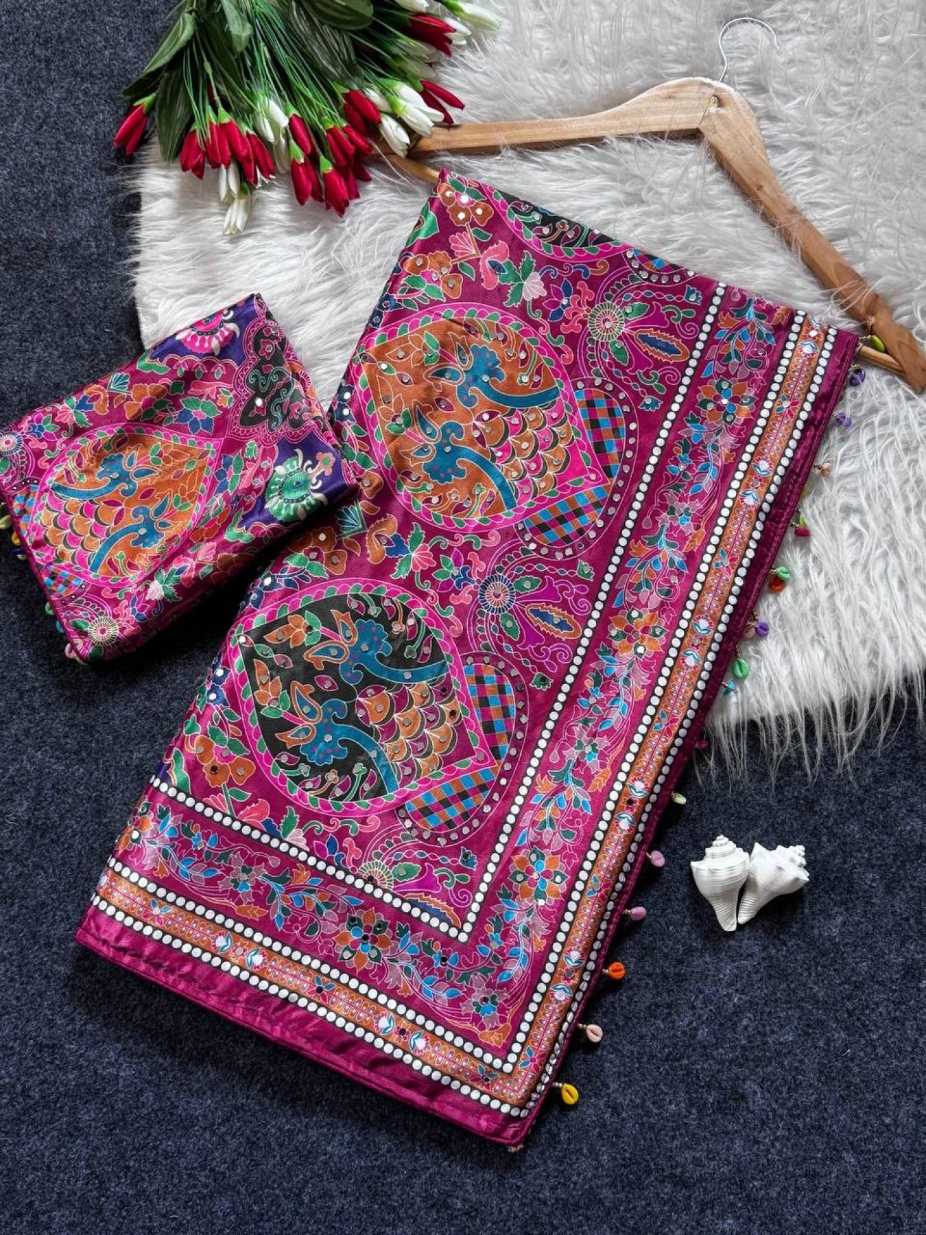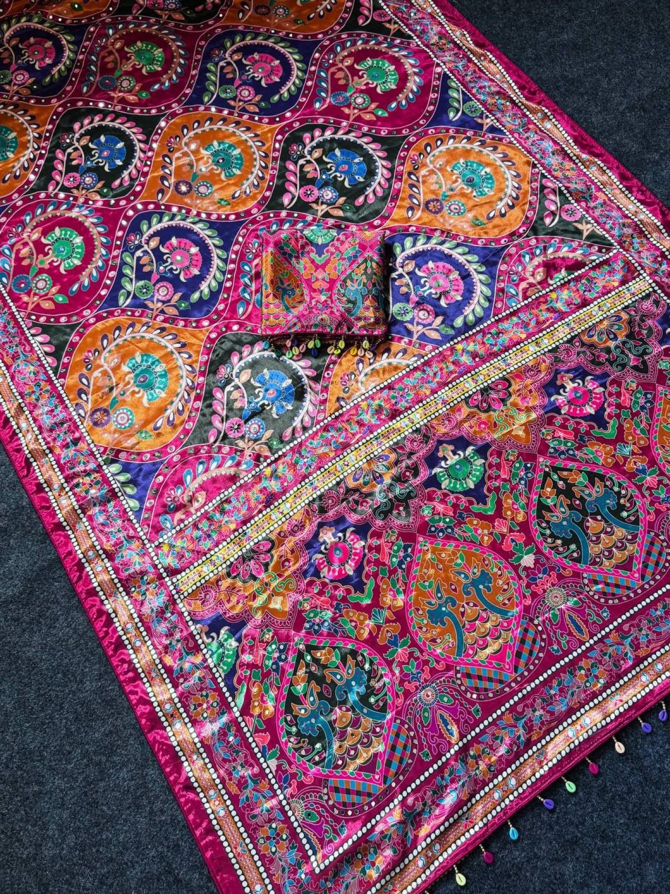 Premium roman silk saree featuring ajrakh print with real mirror work, detailed piping border and kodi latkan pallu paired with matching blouse. Perfect for festive and traditional wear.