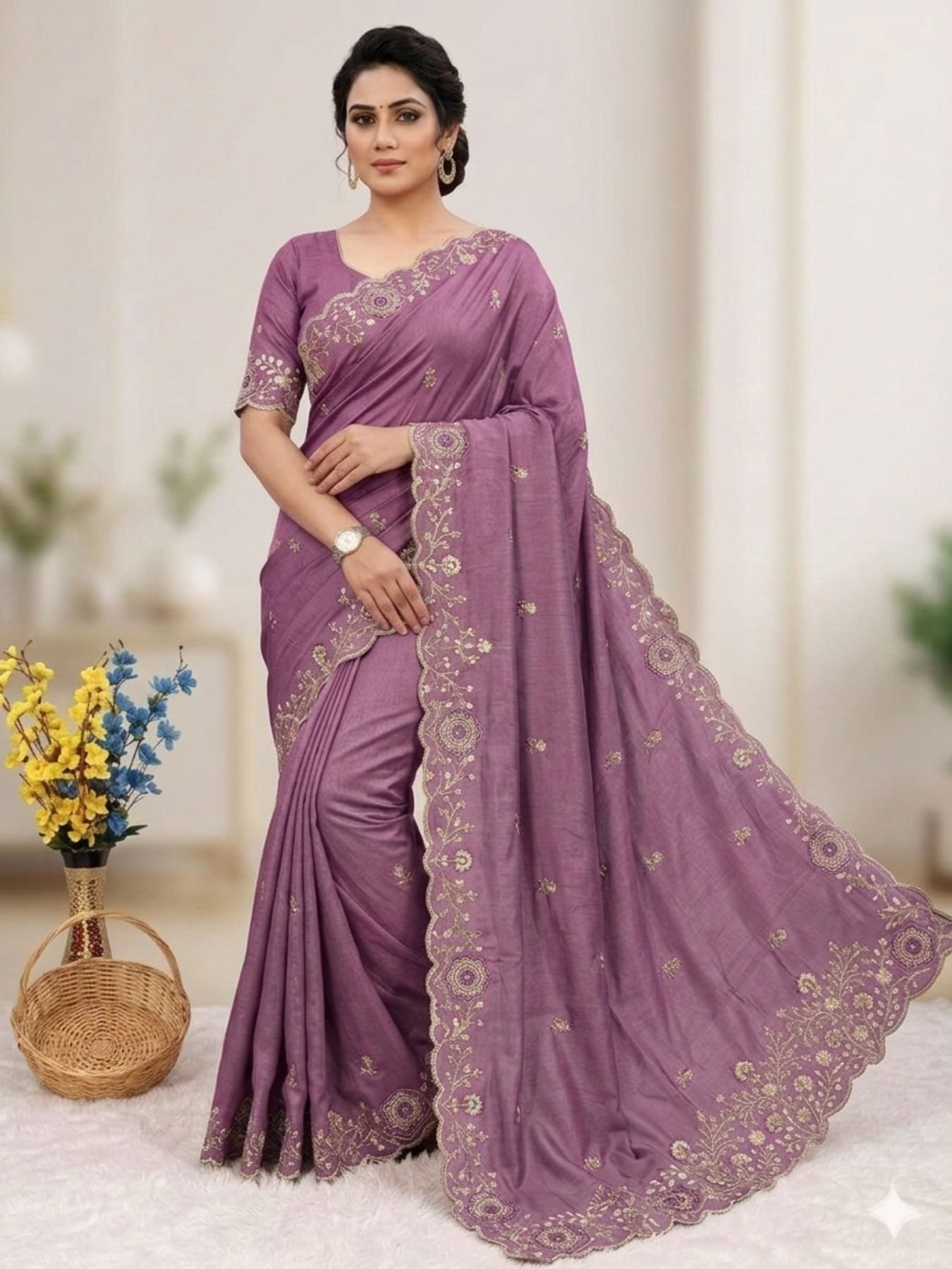Stylish saree crafted in rich chocolate tone featuring full embroidery sequins work with elegant C-pallu design. Paired with matching embroidered blouse, perfect for party wear and festive occasions.