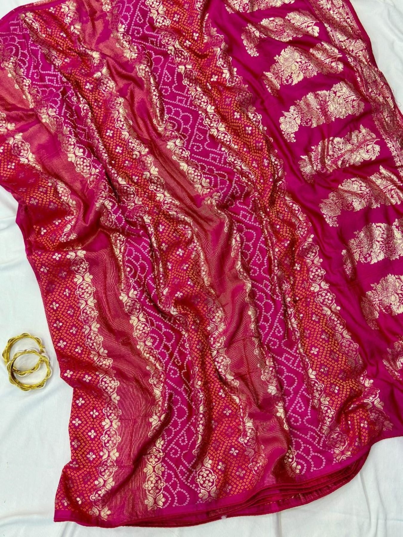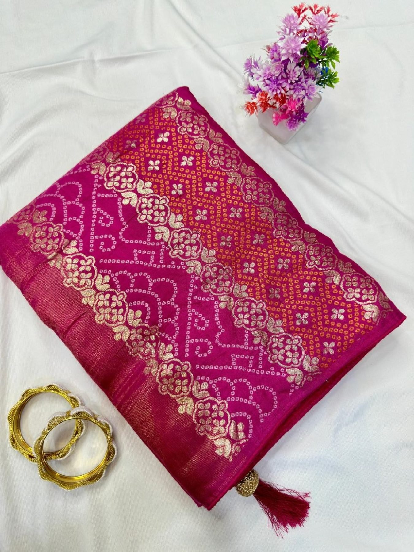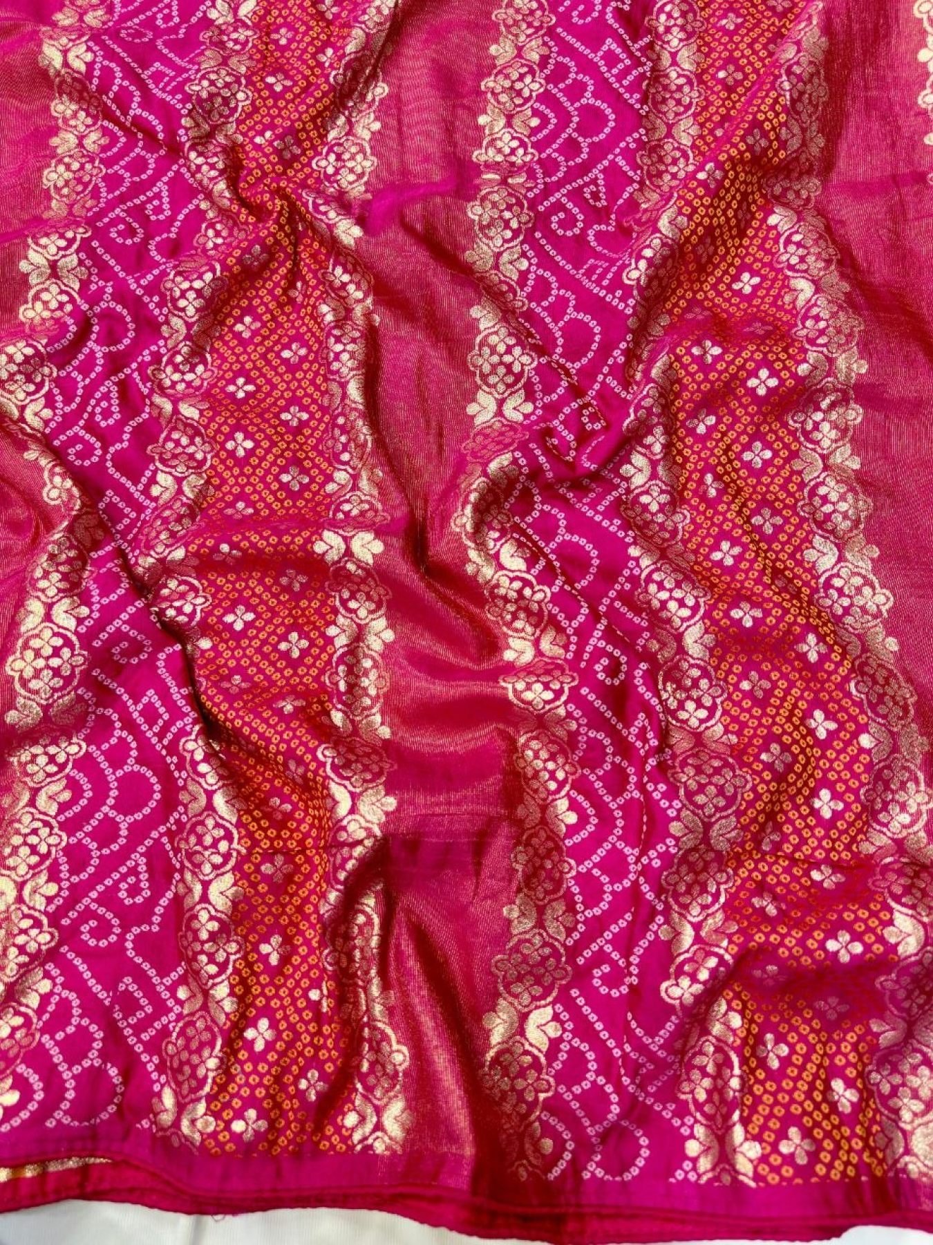Premium dola silk bandhani saree with zari fusion weaving, heavy Jaipuri pallu, and all-over butti design. Comes with contrast blouse for a rich traditional look.