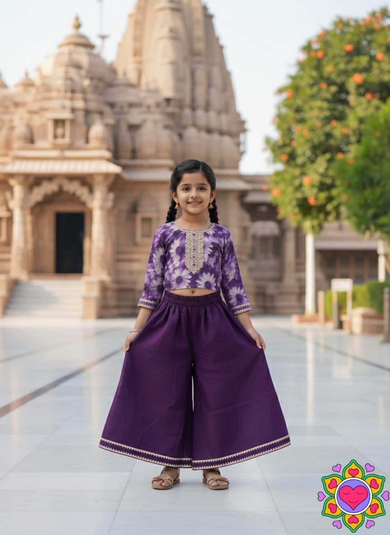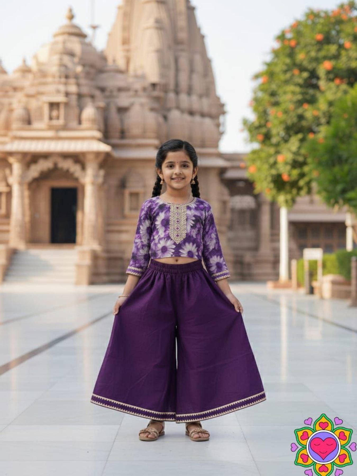 Stylish kids cotton blend kurti plazzo set featuring floral print with beads and stone work. Comfortable and perfect for daily and festive wear.