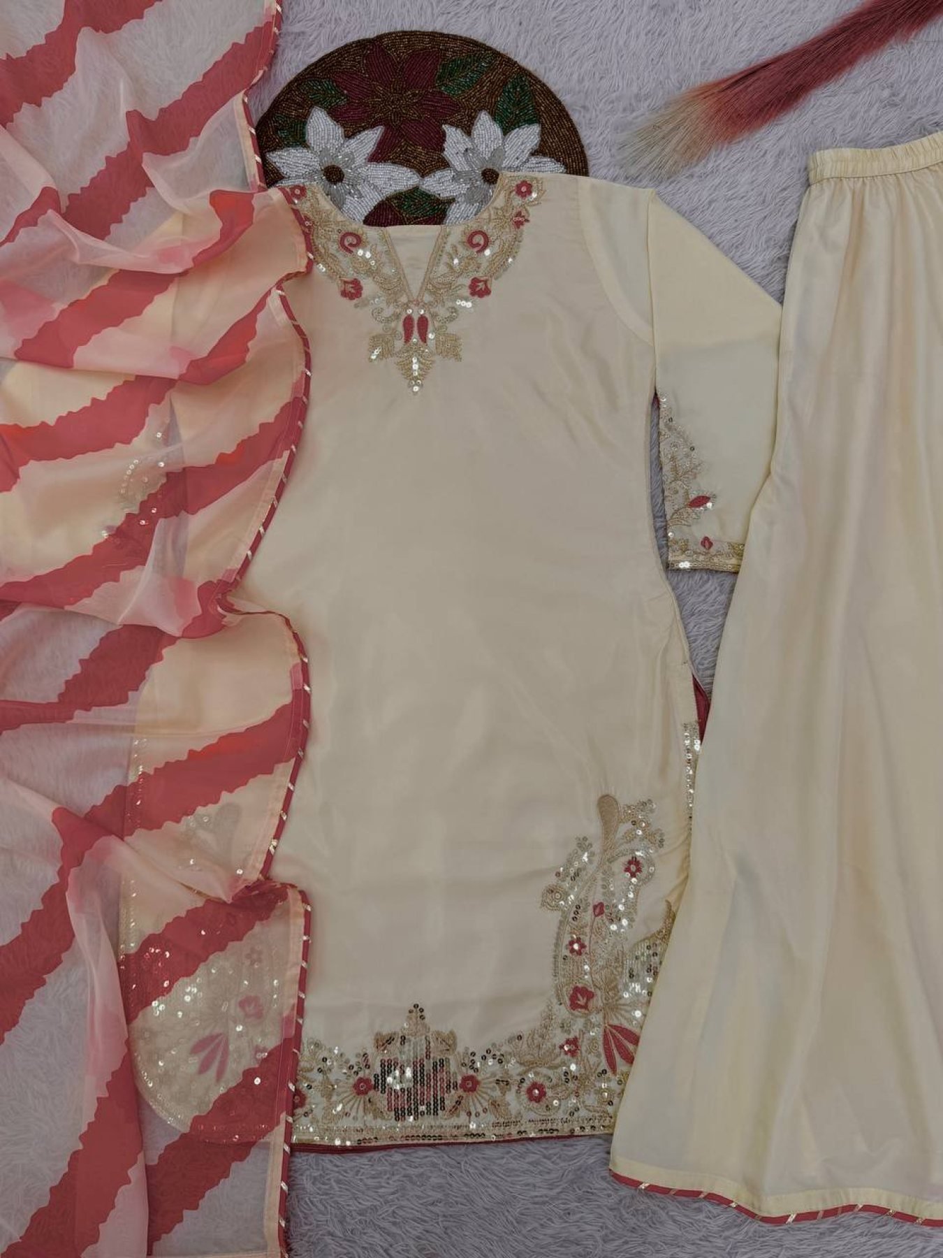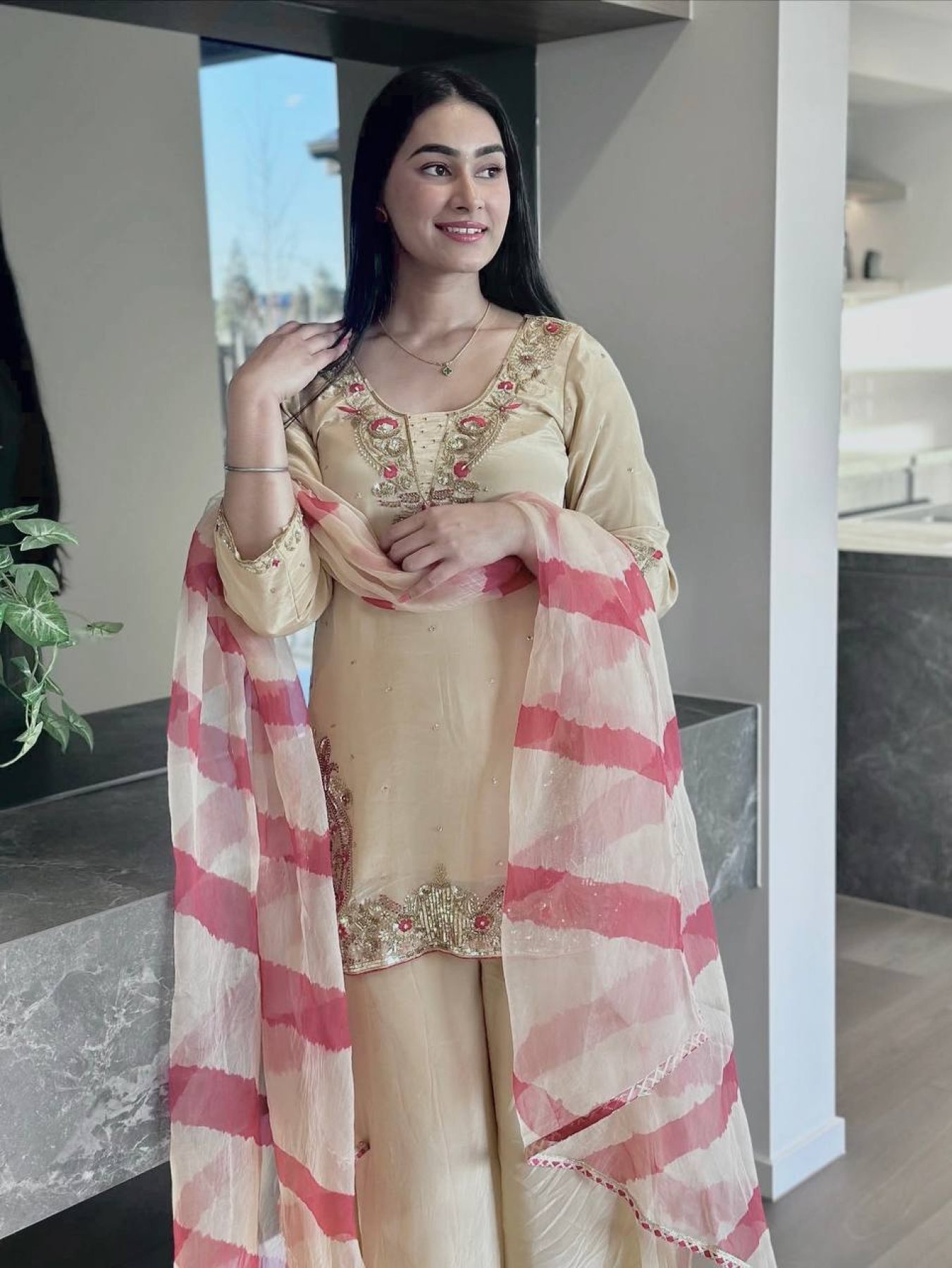 Special Impact Cream Crepe Silk Embroidered Top Plazzo Set with Digital Print Organza Dupatta