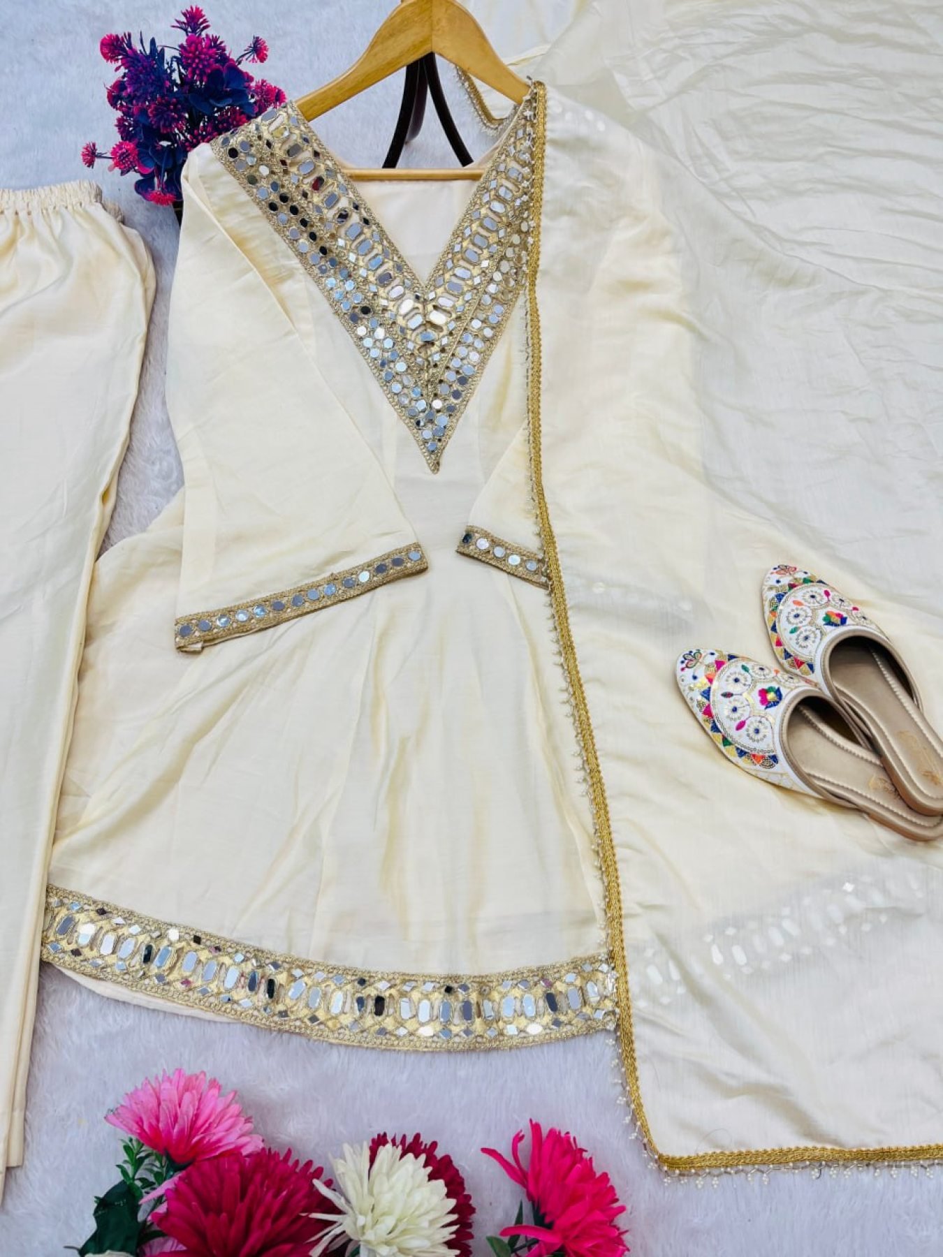 Splendid Chinon Silk Real Mirror Work Silk Kurti Set with Full Flair Plazzo for a Wedding Wear