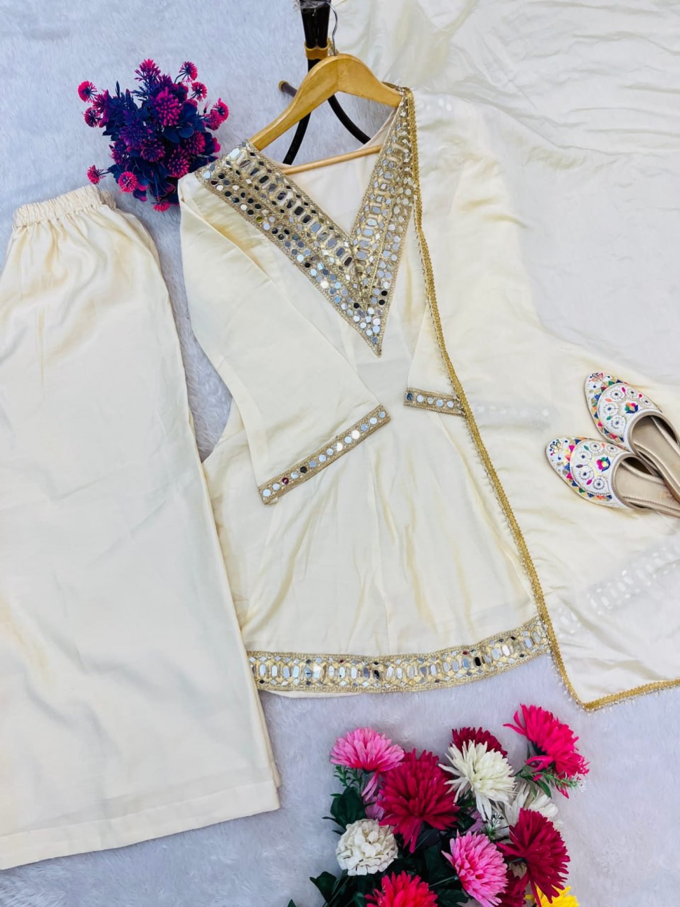 This Pure Chinon Silk Kurti–Plazzo Set features stunning real mirror work on the neckline and a graceful 3-meter flair with mirror border.