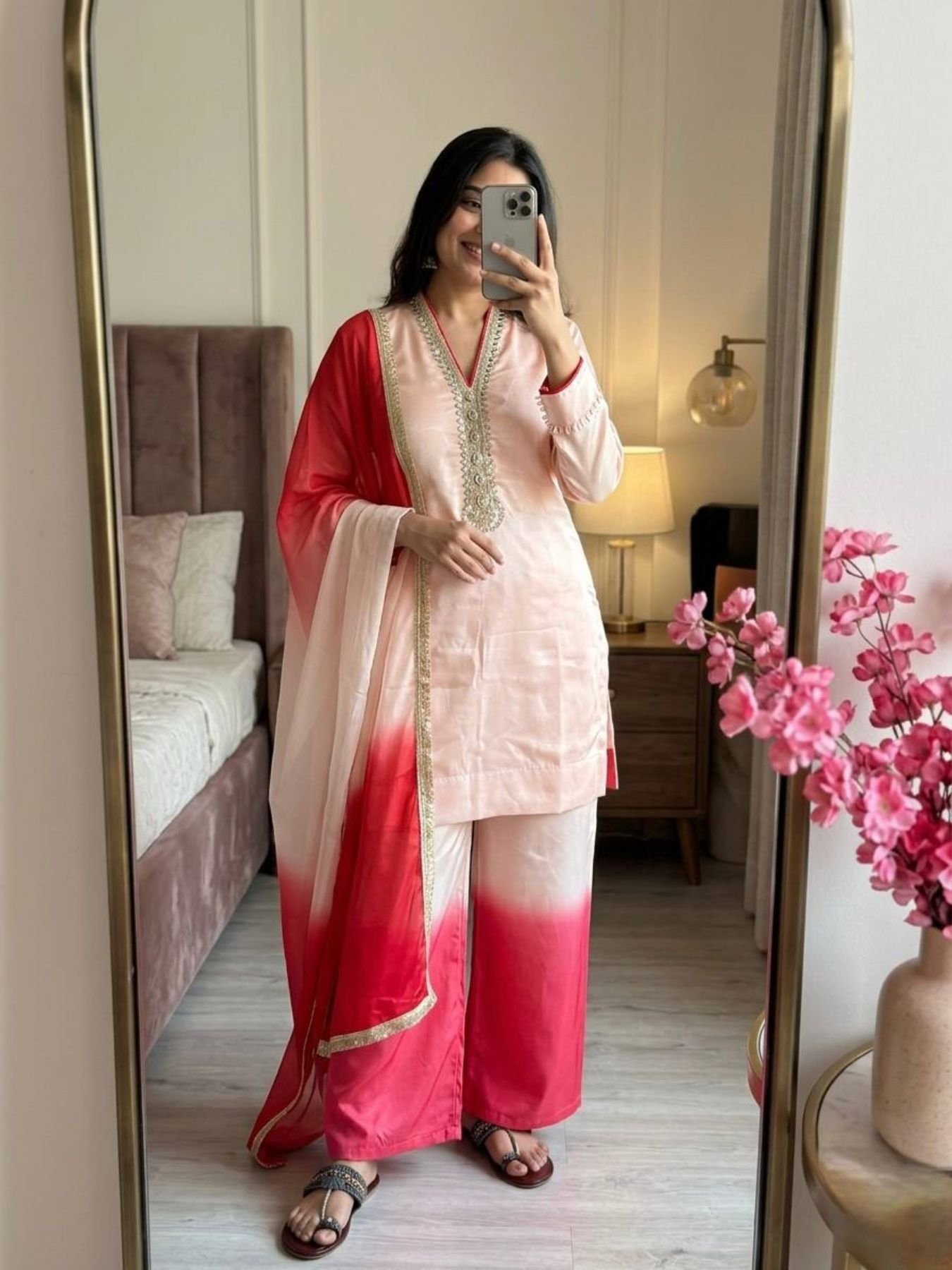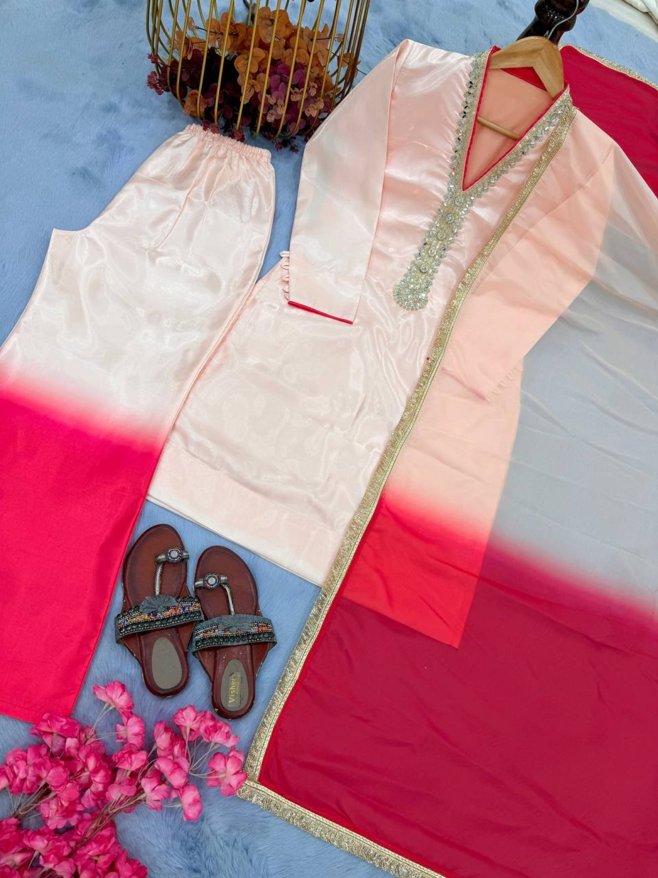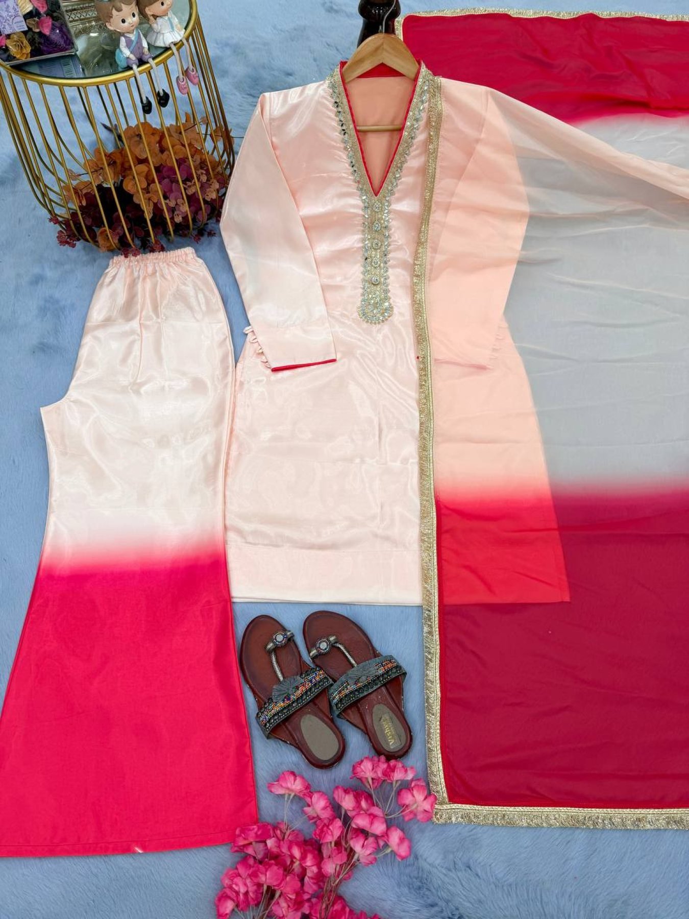 A bold and viral festive look with this premium Roman glass set featuring detailed coding dori embroidery with real mirror hand work and stylish fancy sleeves. Paired with a dual tone plazzo and a soft tabby organza silk dupatta with lace border, this outfit delivers a perfect mix of modern glamour and traditional elegance, ideal for weddings, parties, and festive occasions.