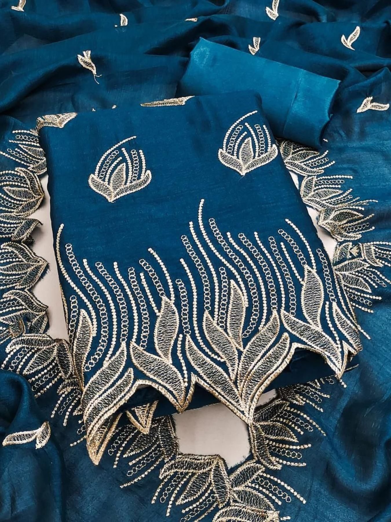 Elegant vichitra silk dress material set featuring rich multi work detailing. Paired with santoon bottom and a matching vichitra silk dupatta, perfect for festive and party wear.