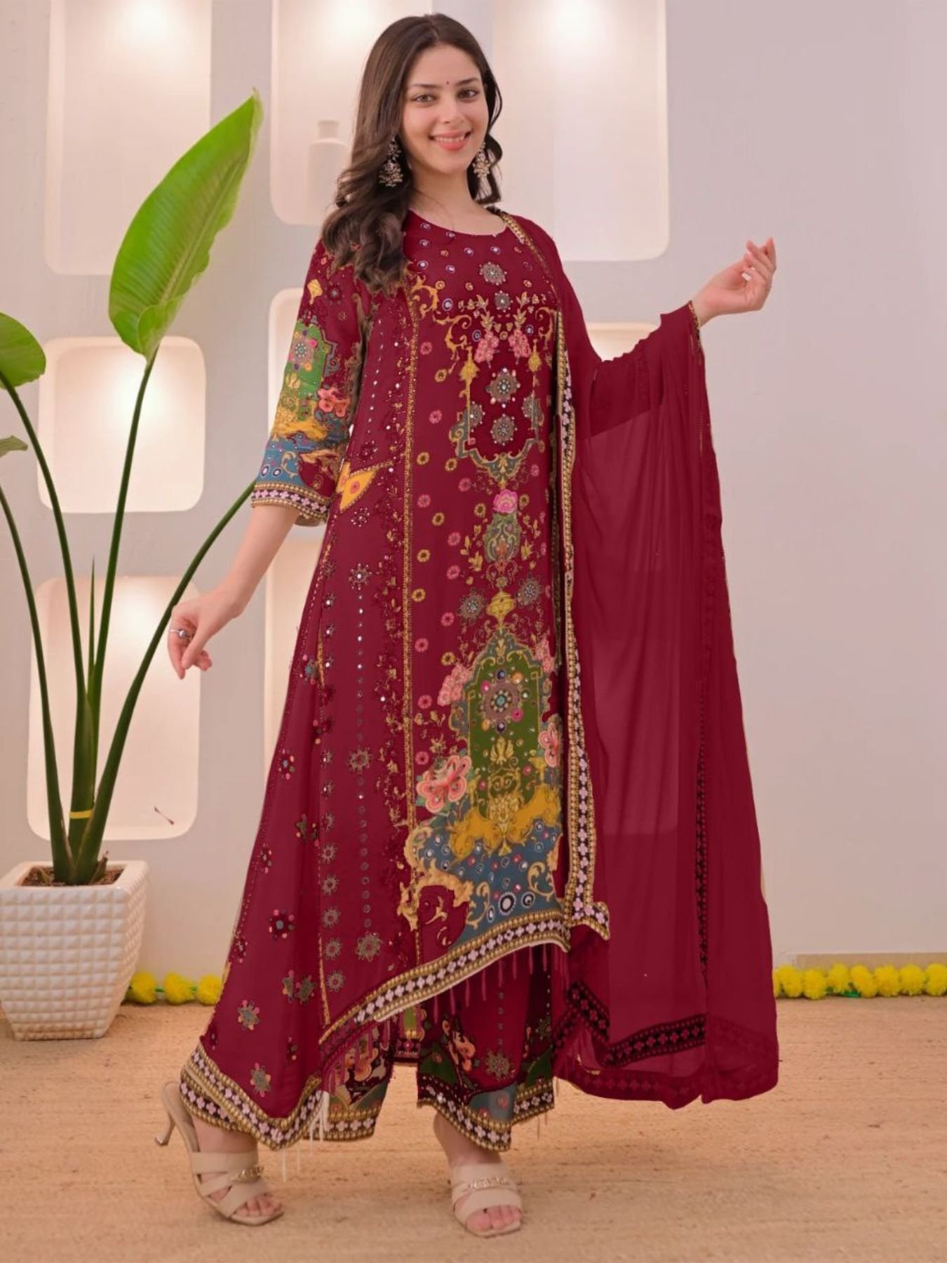 This elegant sharara set is crafted from premium muslin cotton fabric with a comfortable full inner, offering a soft feel and graceful fall. The outfit is beautifully paired with a flowing double shade dupatta featuring a clean, borderless finish for a refined look. Ideal for festive occasions, family functions, and daytime gatherings, this sharara ensemble reflects timeless elegance with understated sophistication. A perfect addition for boutiques, resellers, and export buyers seeking quality ethnic wear at wholesale rates.