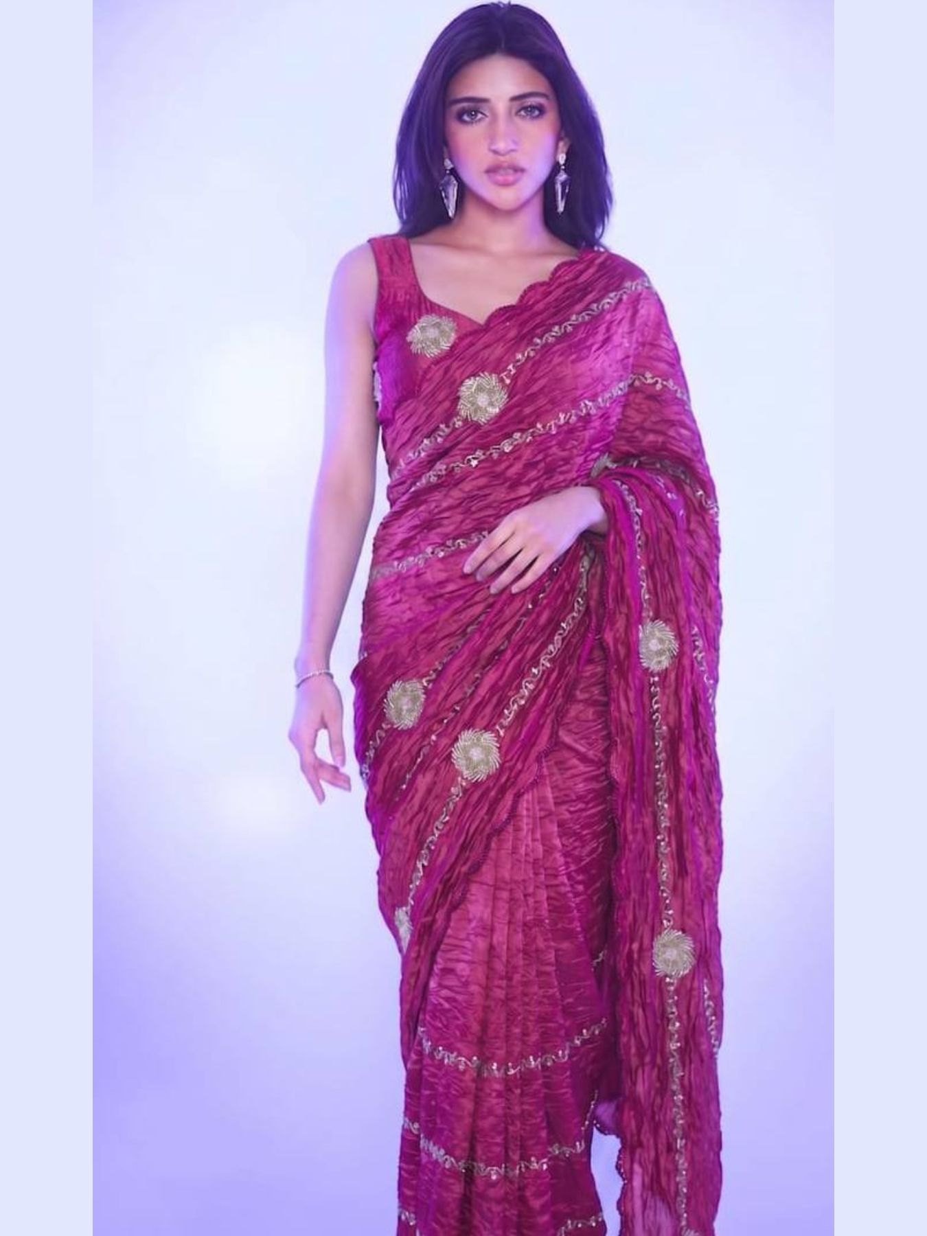 Trendy gold crush saree with all-over beads and sequins work, enhanced with designer cutwork border and matching butta blouse. Perfect for festive and party wear.