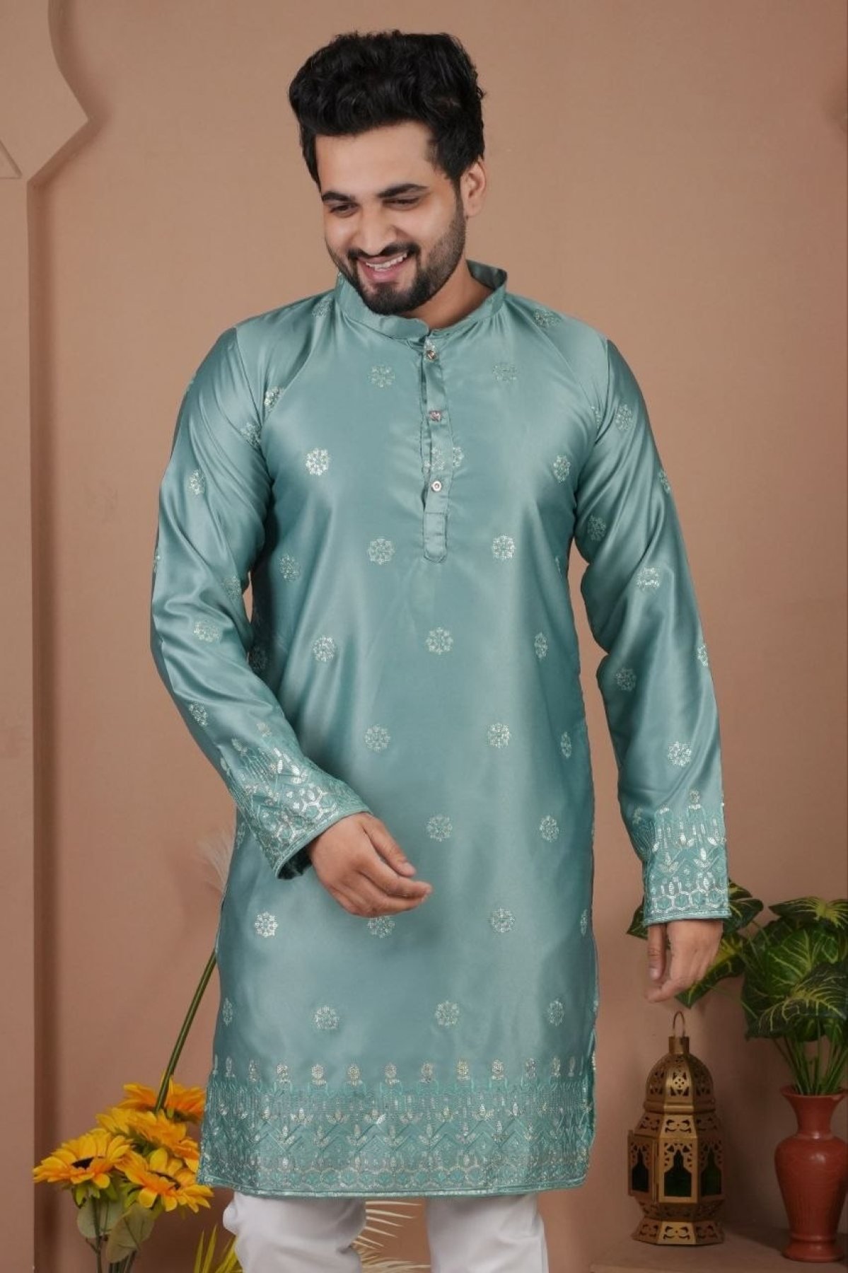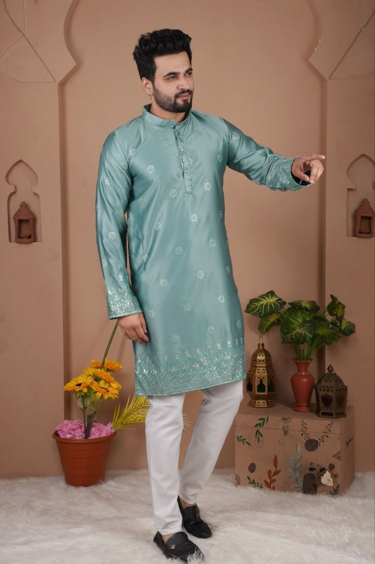 Stylish men’s kurta set in malai silk fabric with heavy embroidery and sequins work, paired with matching pyjama. Perfect for festive and wedding occasions.