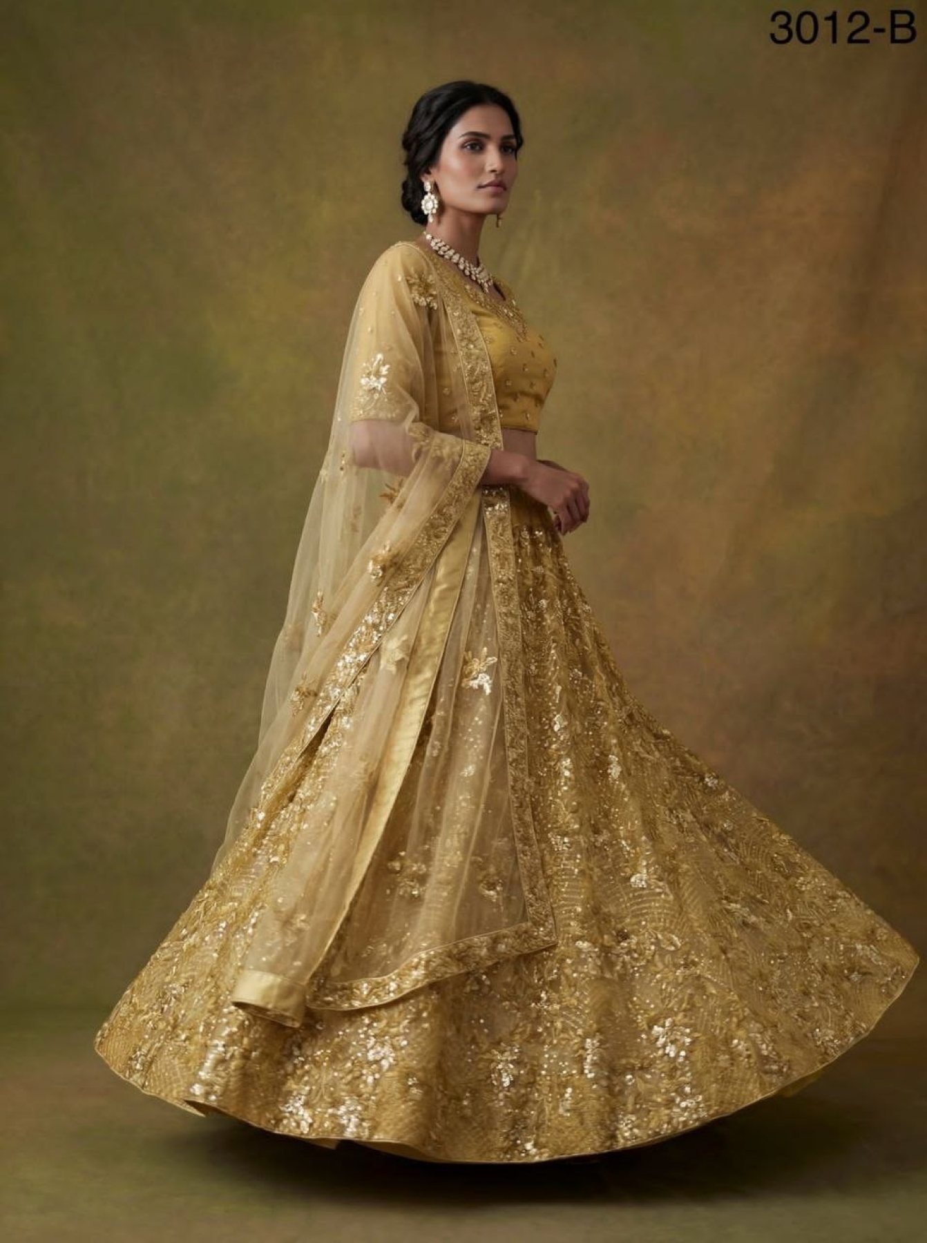 Elegant heavy net lehenga choli featuring floral design with double sequins, thread, and zari work. Paired with designer dupatta and embroidered blouse, perfect for wedding, reception, and festive occasions.