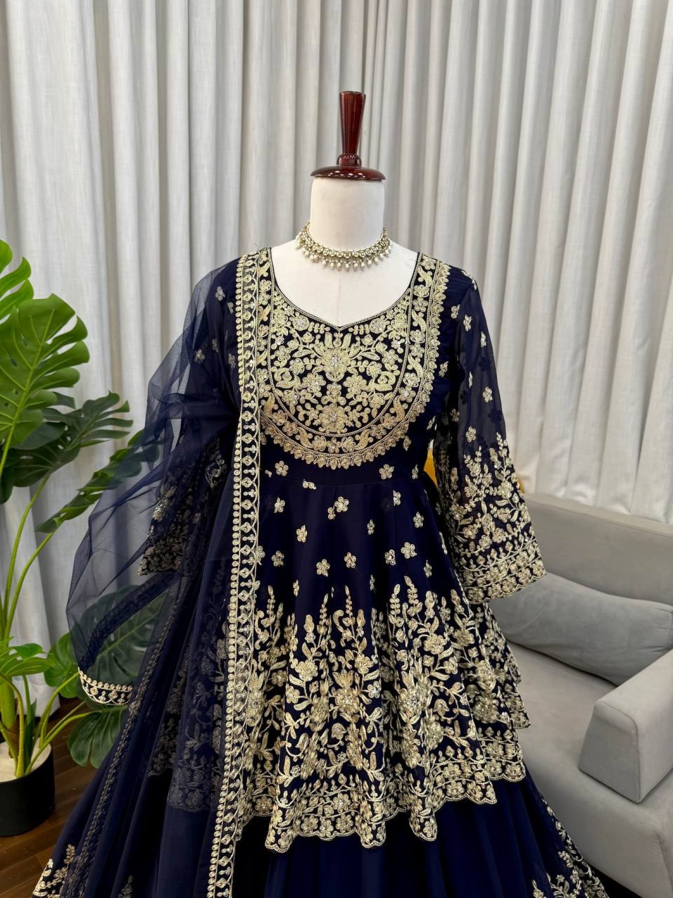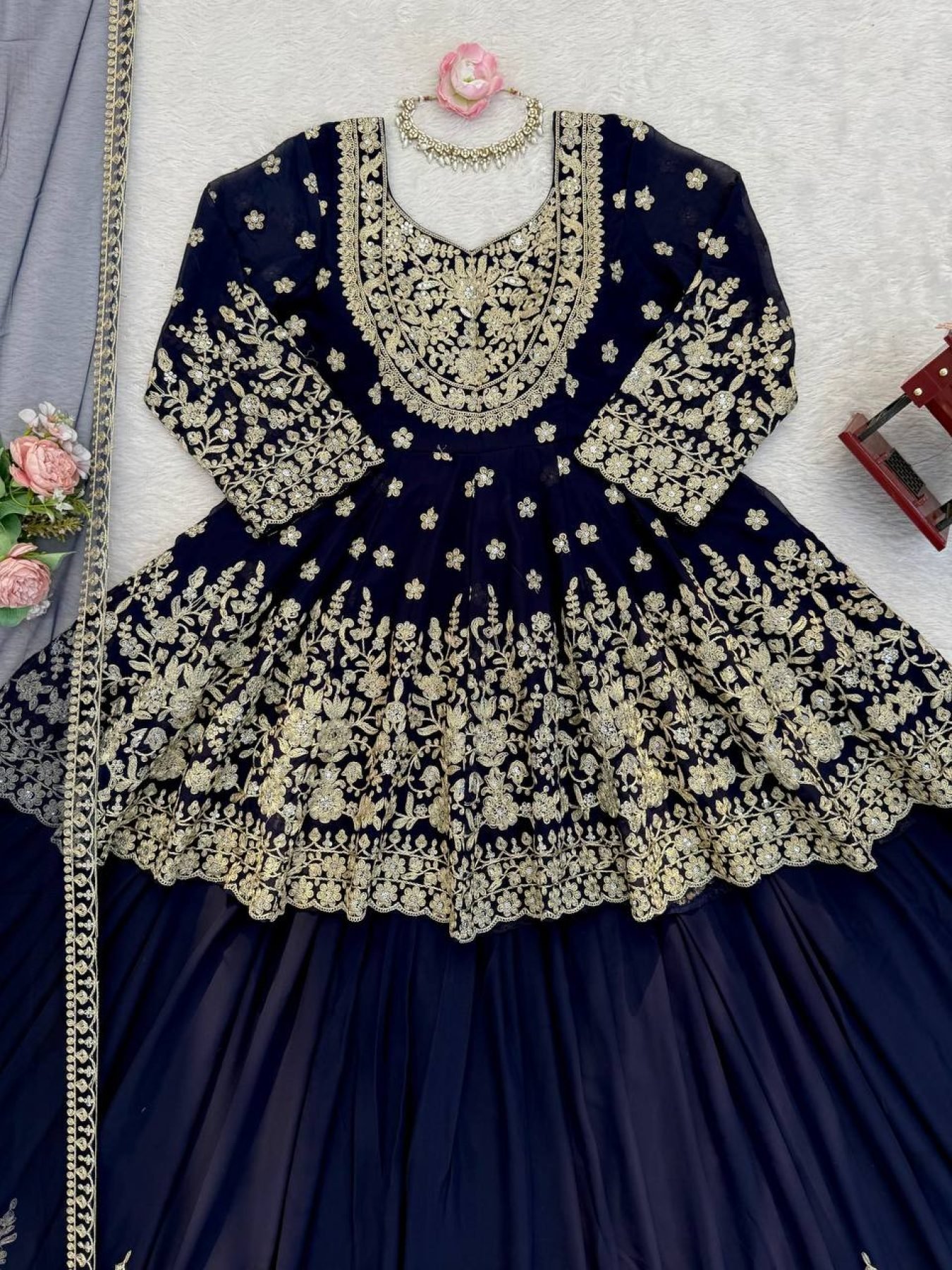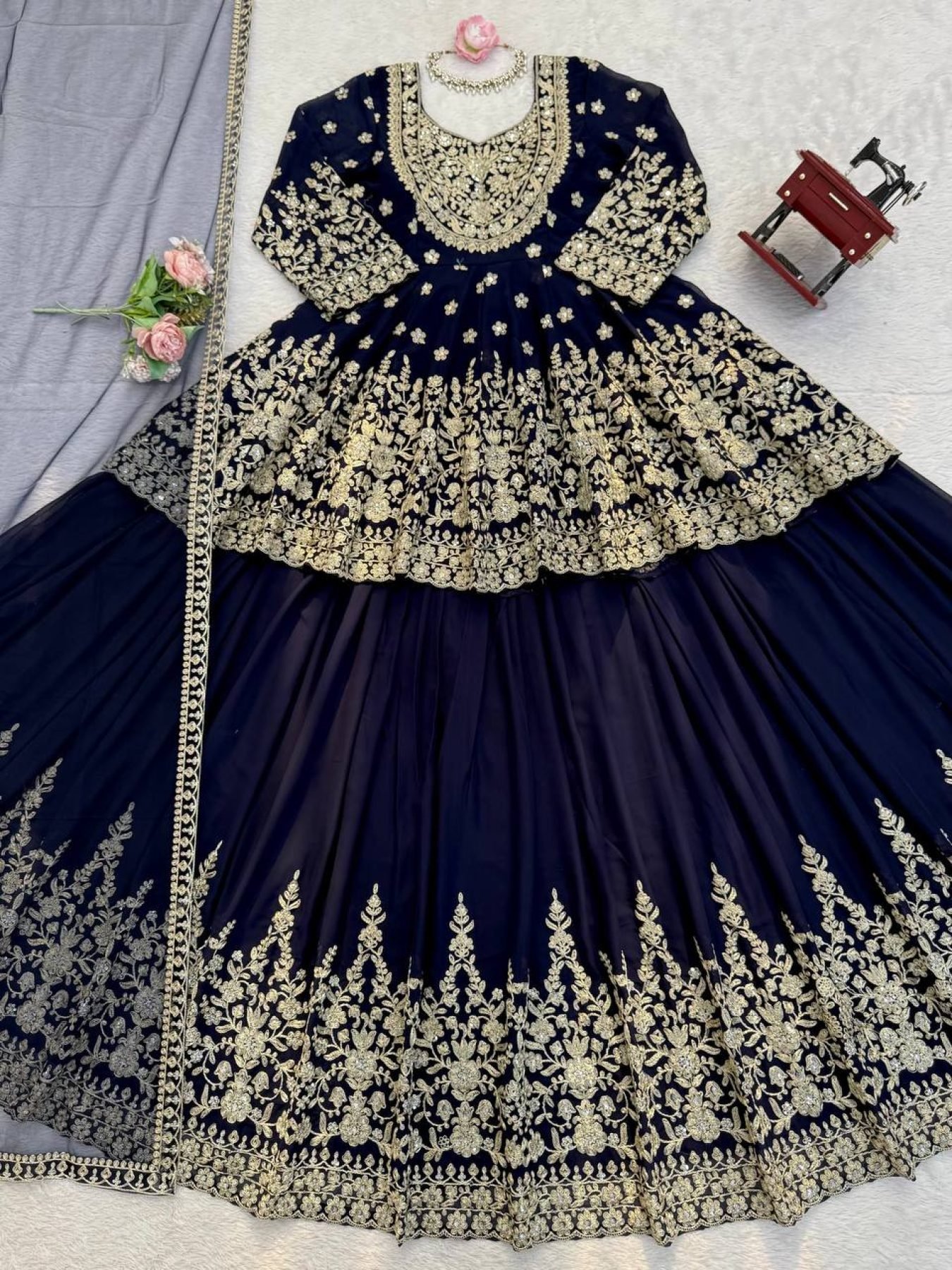 Faux Georgette Lehenga Set featuring coding dori with sequence embroidery on both front and back of the top. Paired with a fully stitched embroidered lehenga and a soft butterfly net dupatta with 4-side lace border. A perfect outfit for weddings, festive occasions, and party wear.