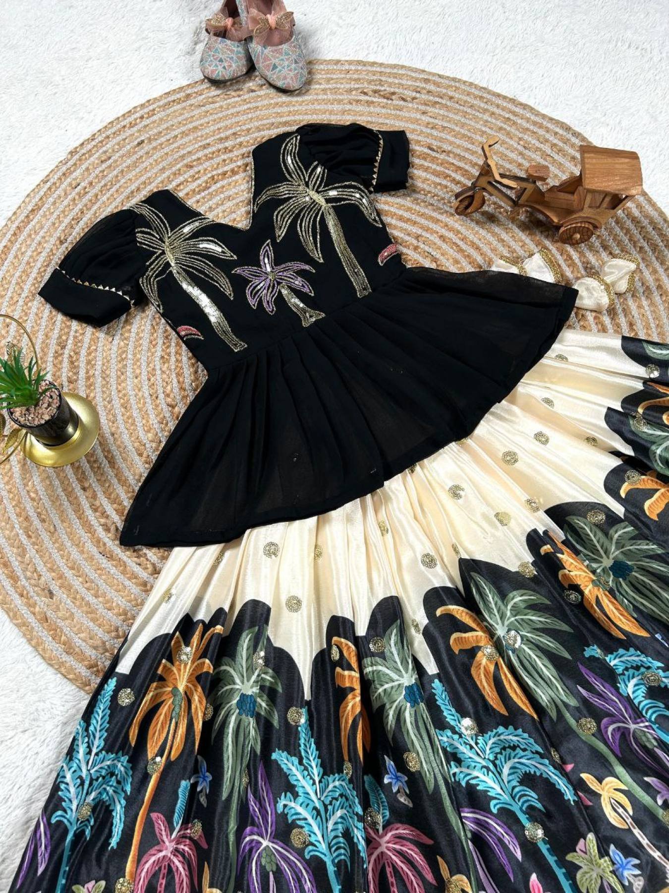 Elevate your little one's ethnic charm with our Designer Kid Lehenga Choli, crafted from premium faux georgette and heavy chinon silk. The set features delicate embroidery with sequin work, perfect for festive wear, weddings, and traditional occasions.