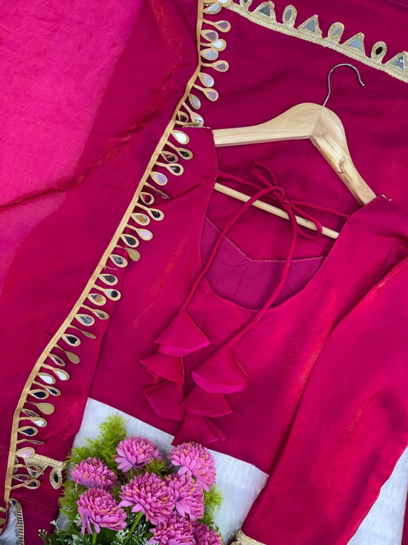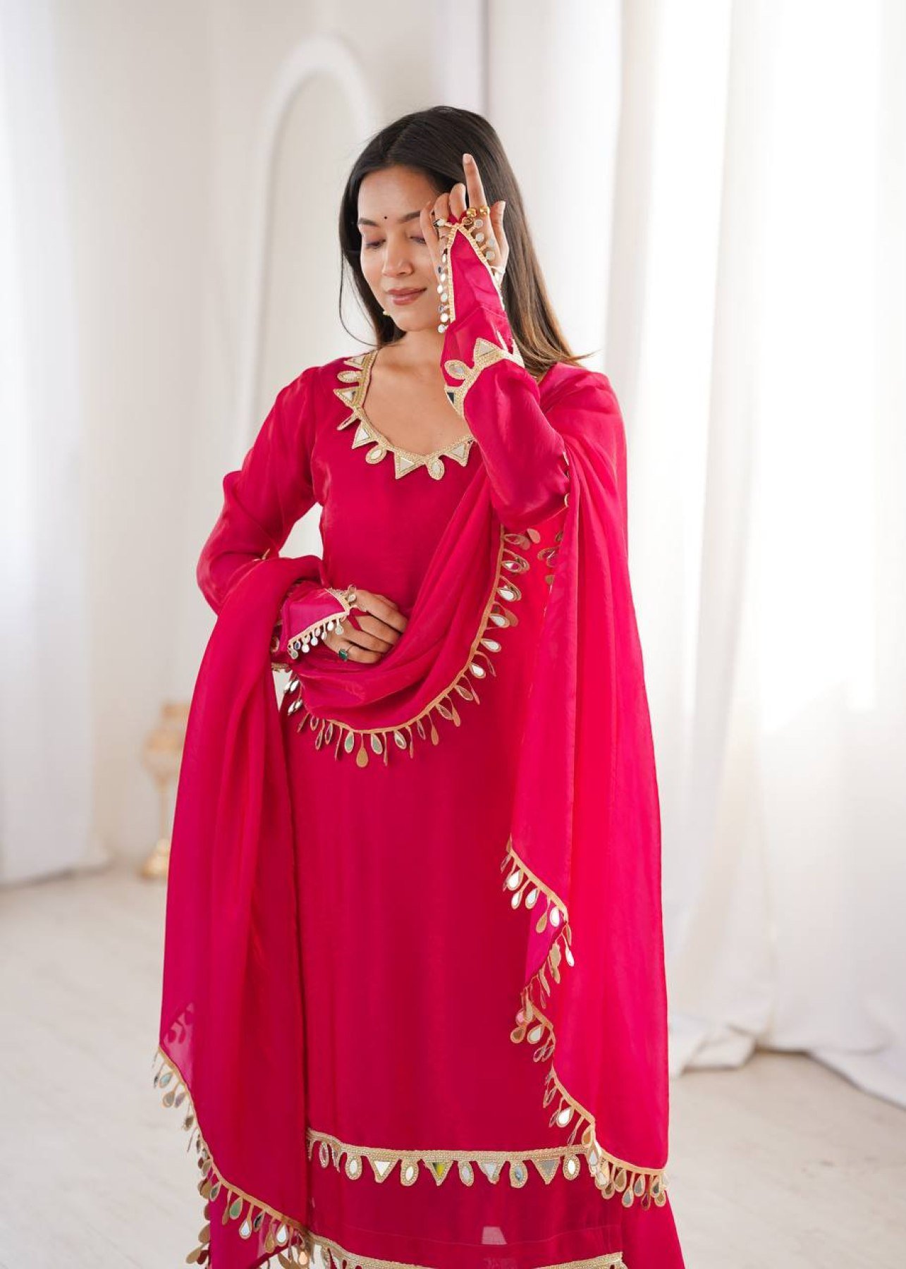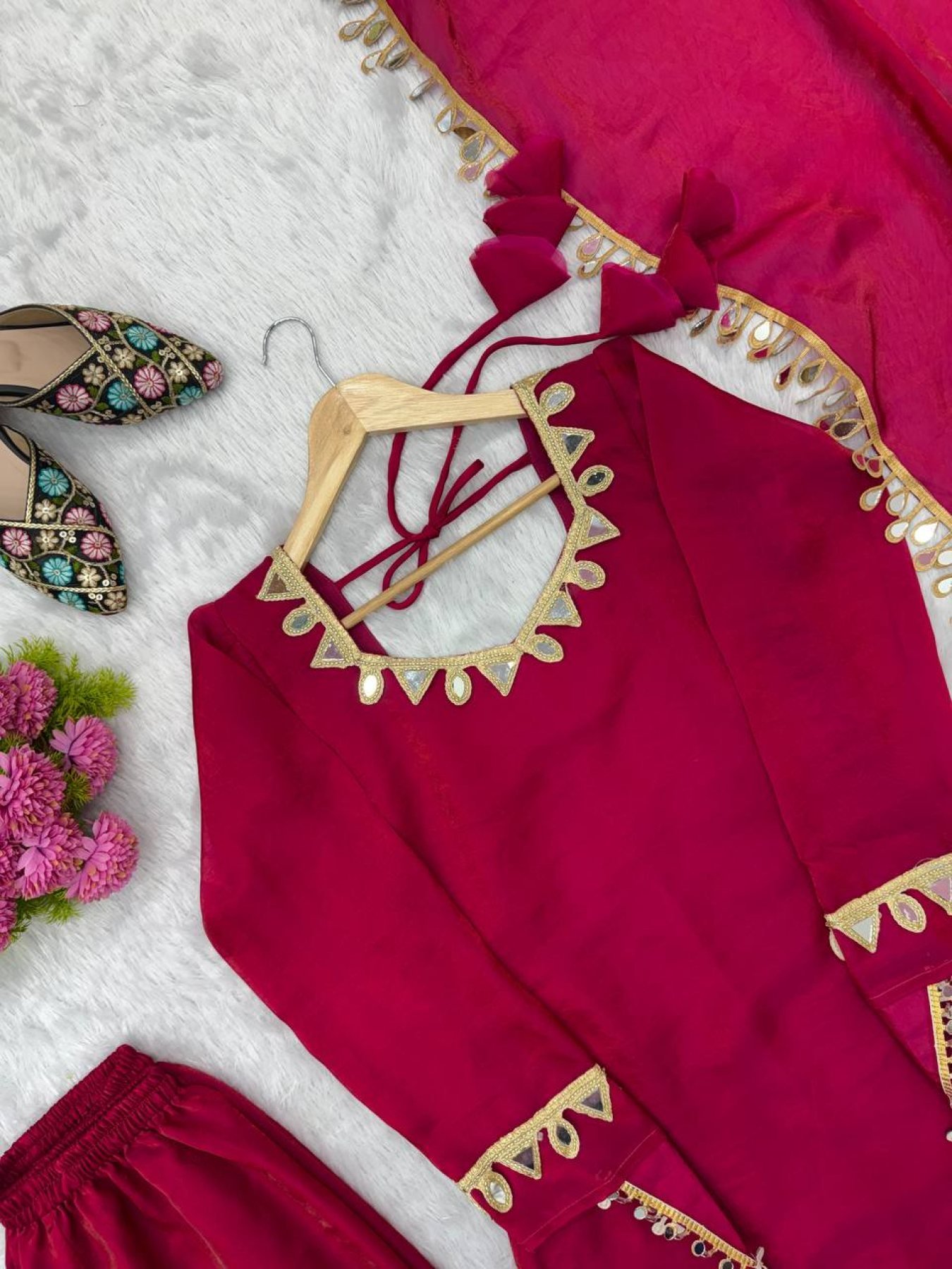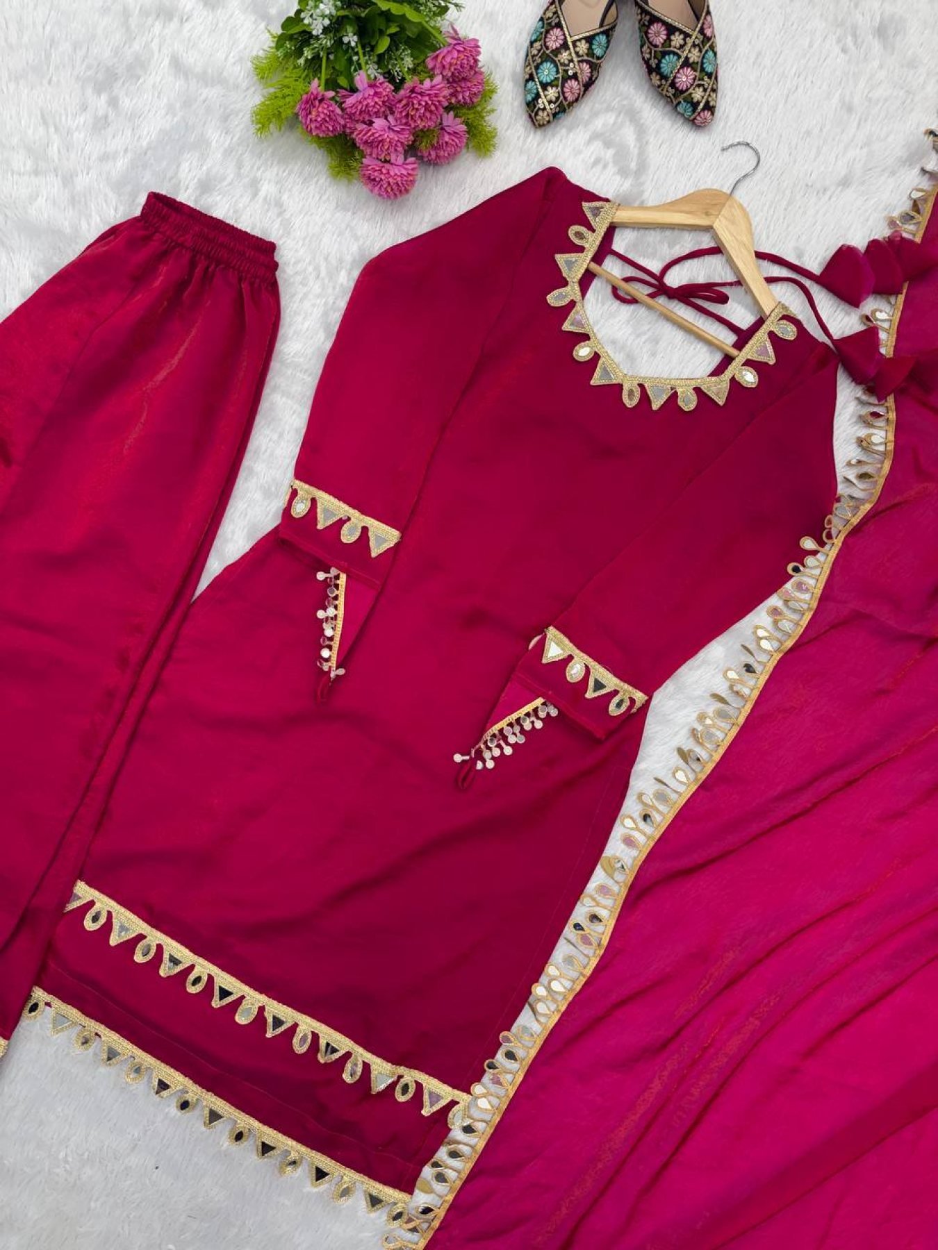 Ethnic set crafted in premium Fendy Silk featuring real mirror lace work on the top and dupatta. Designed with soft micro cotton inner for comfort and paired with a stylish palazzo for a graceful festive look. Perfect for weddings, festive wear, and party occasions.