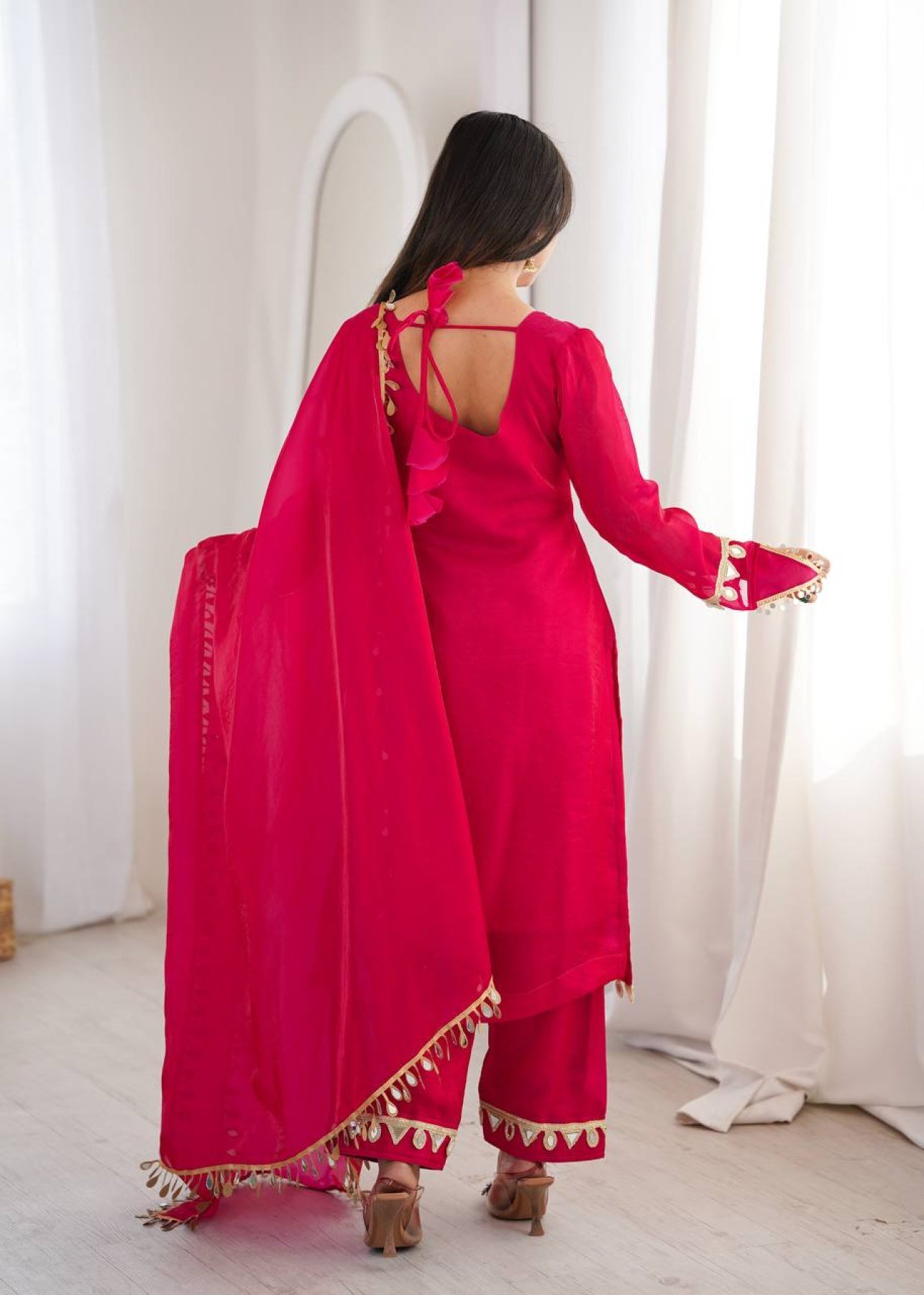 Stylish Hot Pink Ready To Wear Fendy Silk Kurta Set with Mirror Lace Work and Palazzo