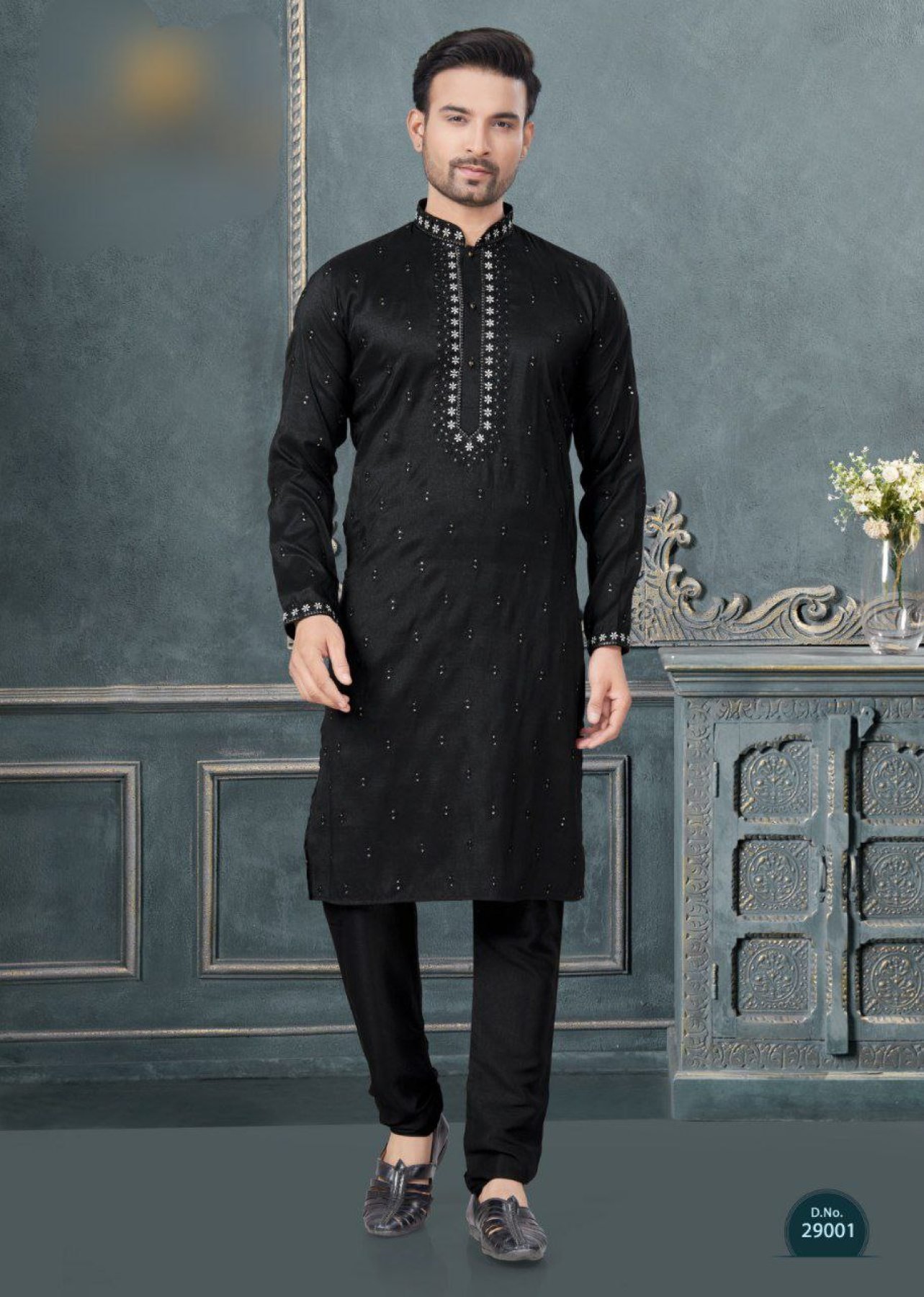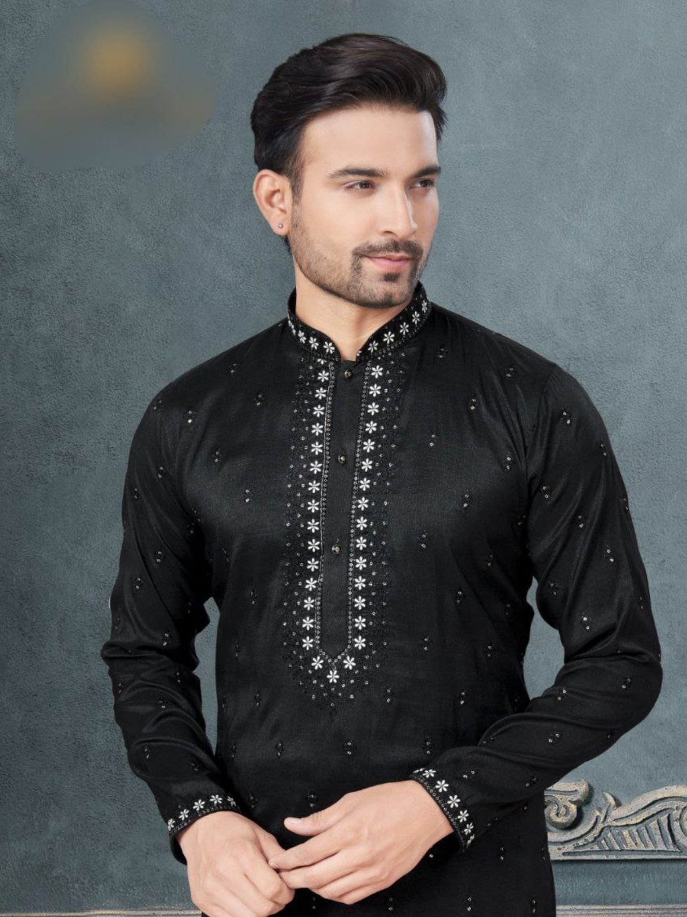 Stylish Mens Silk Kurta Pajama in Black with Embroidery At Wholesale Rate