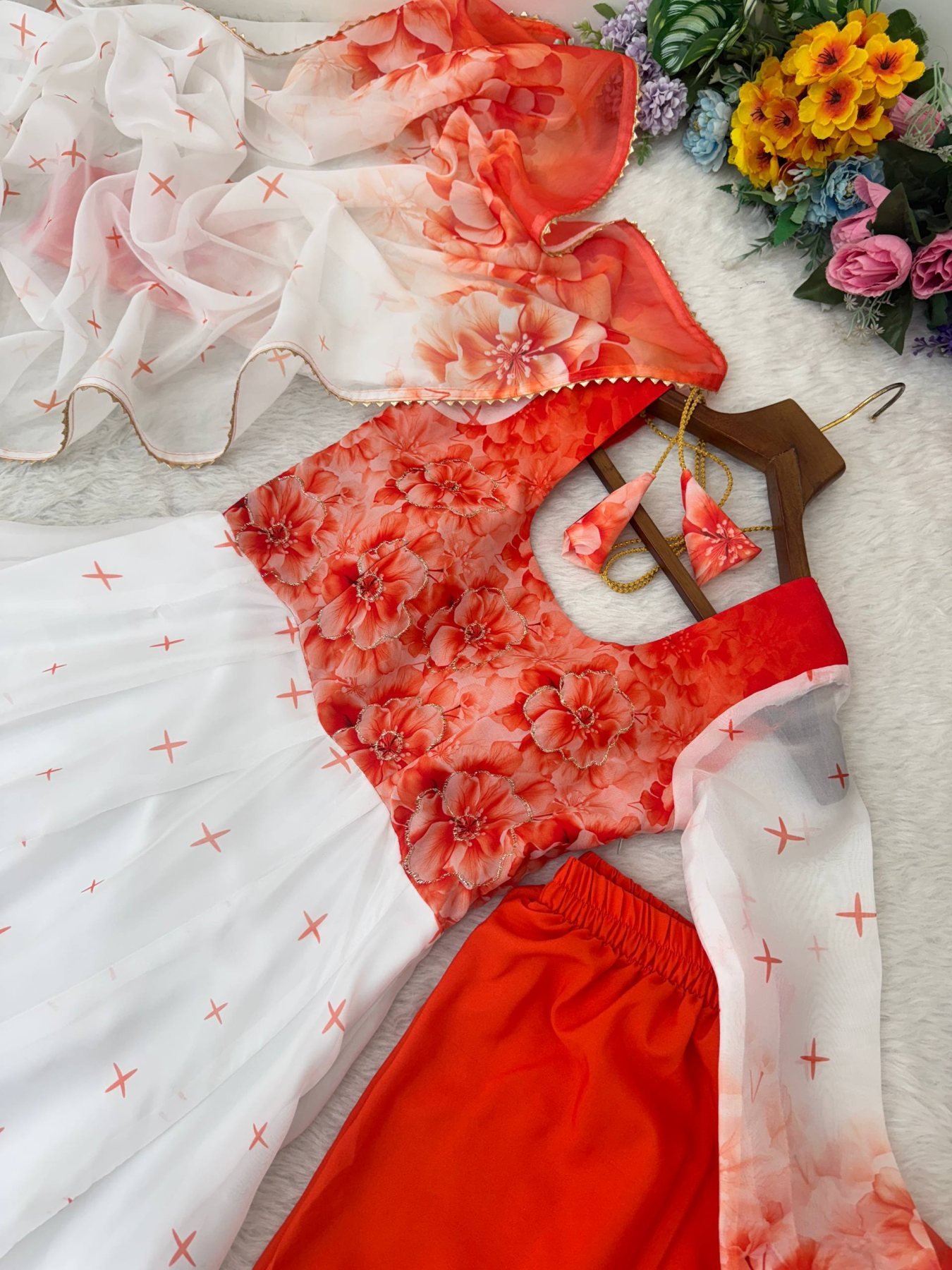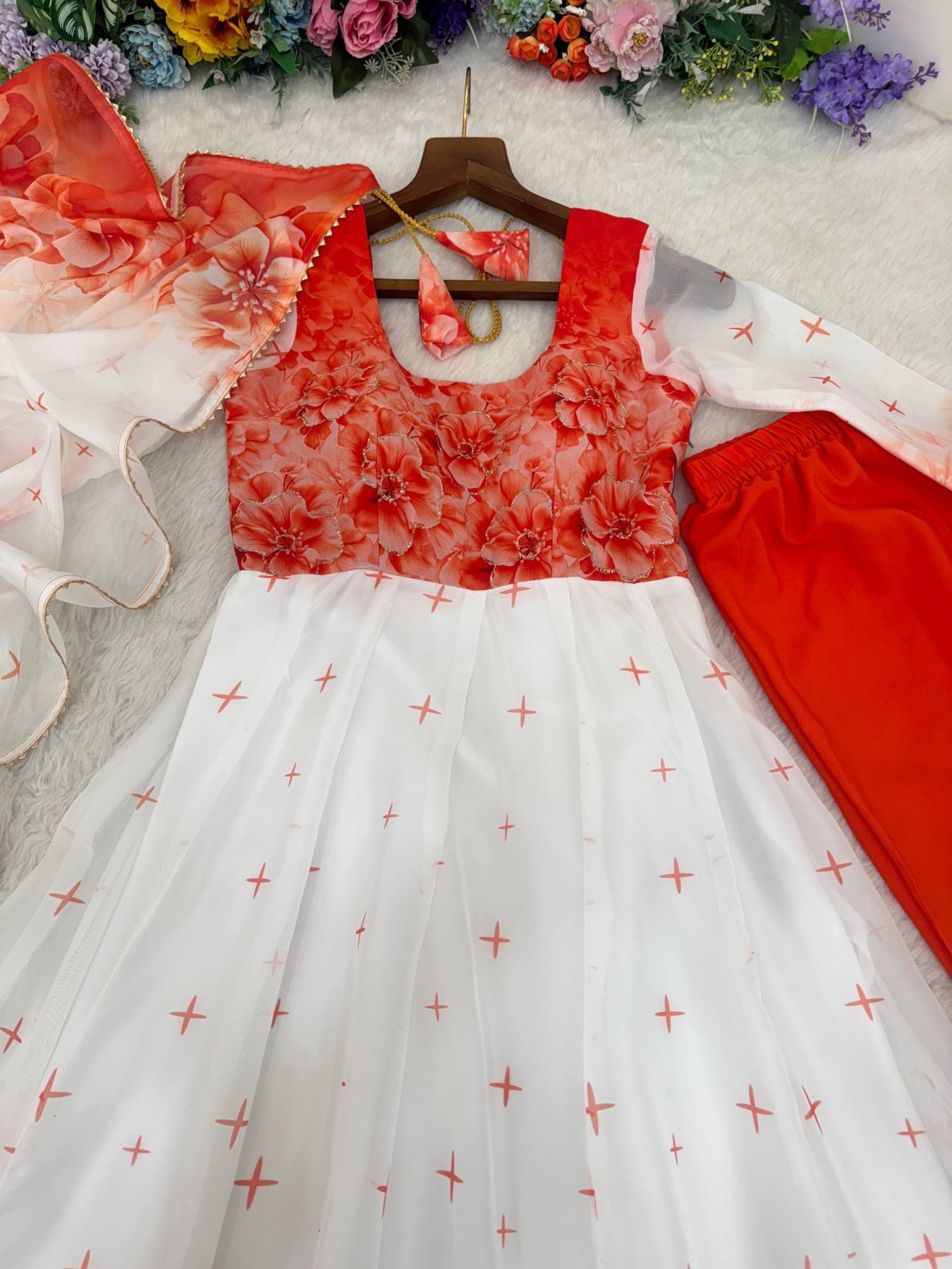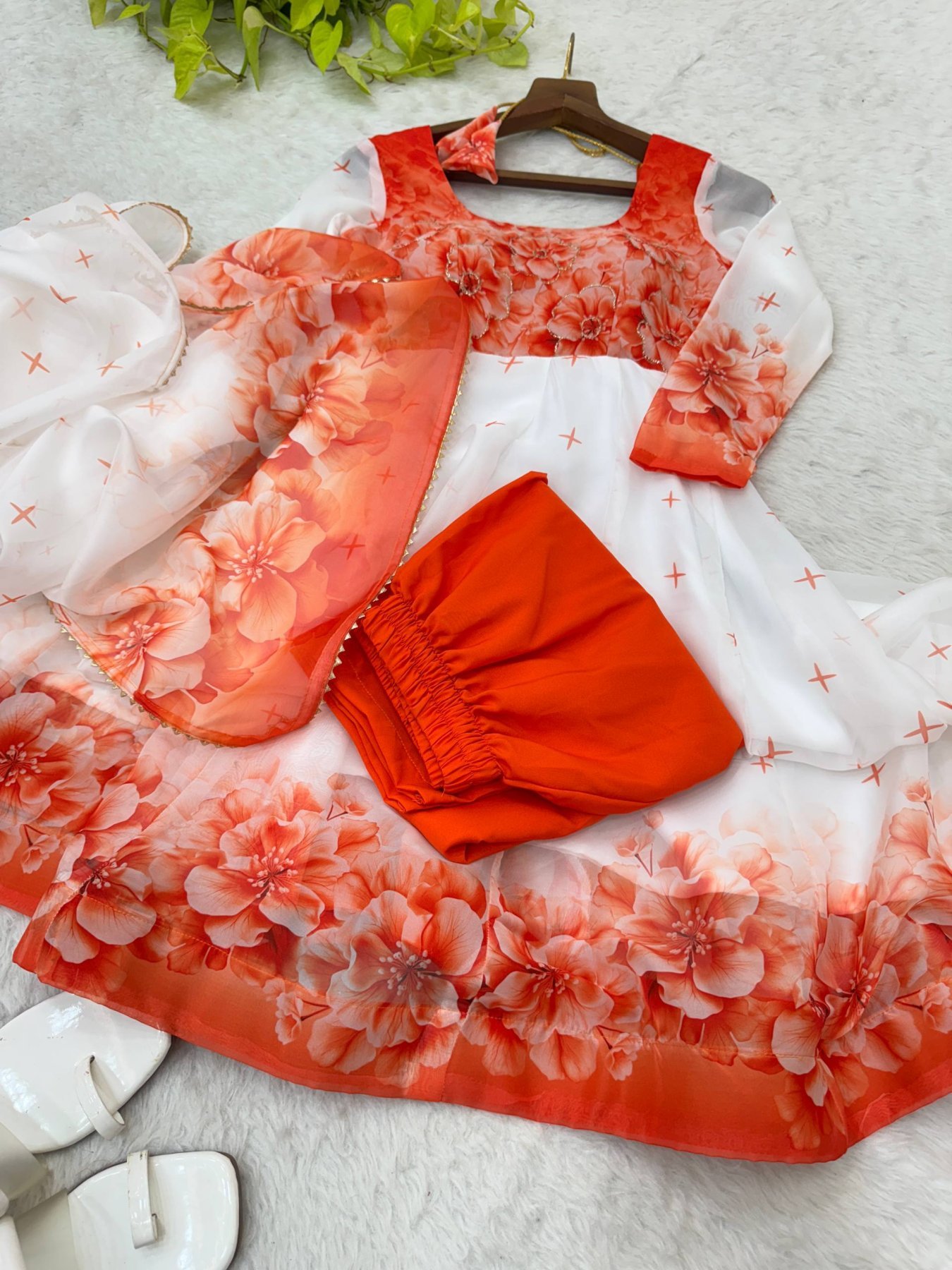 Bring luxury and grace together with this Designer Organza Taby Silk Gown Set, beautifully detailed with digital prints and hand rebin work. Crafted from premium soft Taby Silk, this gown flows with 14 kalis for a rich flare and comes paired with a butter crepe pant and a golden lace bordered dupatta — a perfect blend of tradition and style for weddings, parties, and festive evenings.