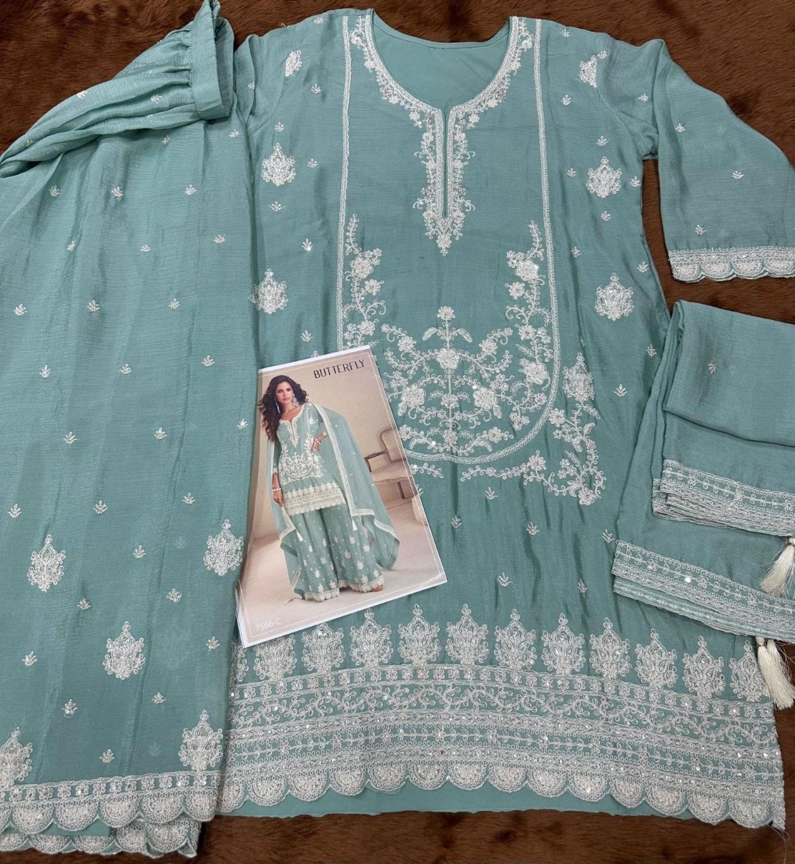 Premium chinon silk suit set featuring heavy embroidery sequins work on top, bottom, and dupatta. Custom stitching available, perfect for festive and wedding wear.