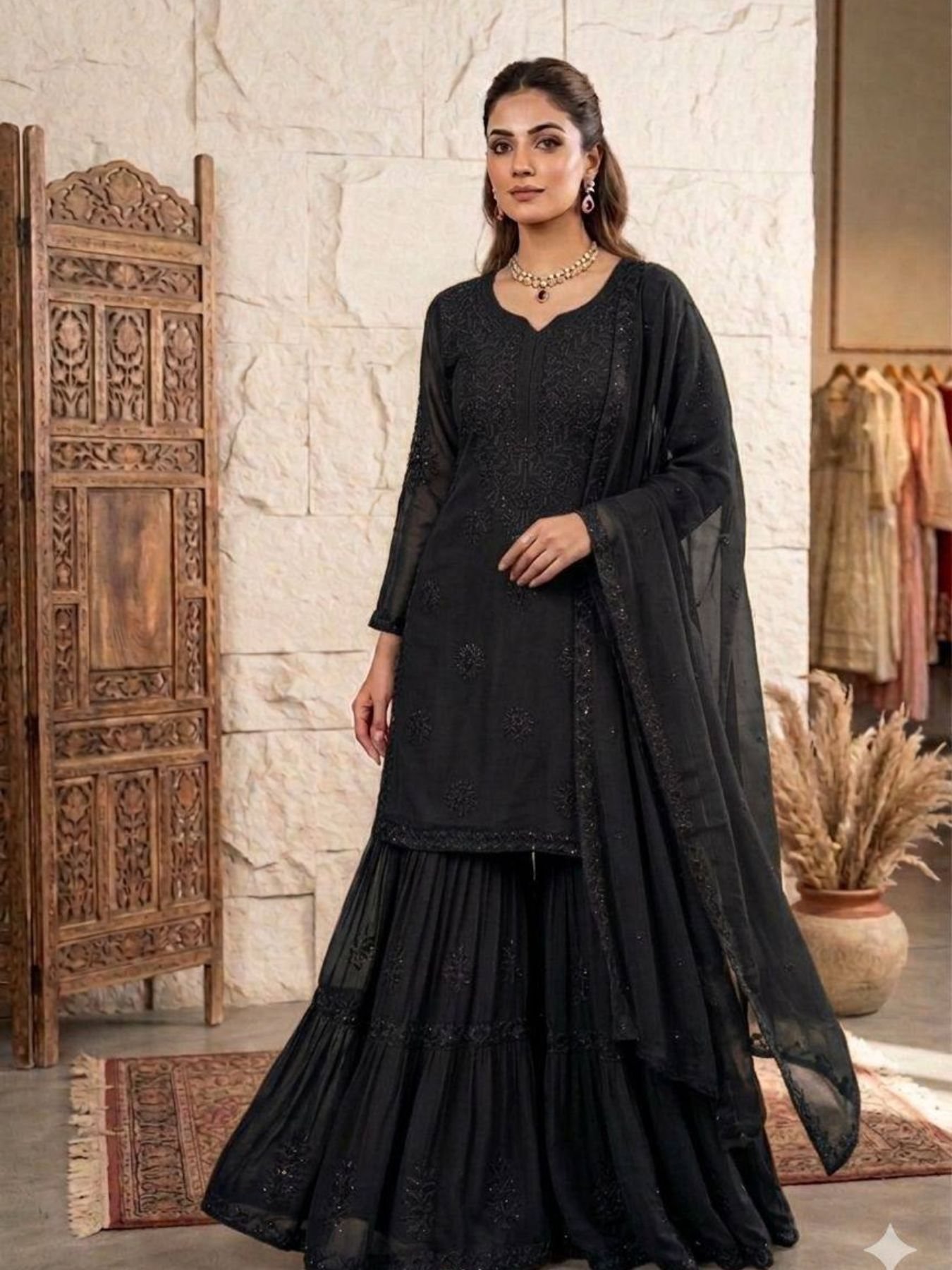 Step into a trendy and viral ethnic look with this elegant georgette sarara set featuring beautiful sequence embroidery work for a rich and graceful designer finish. Paired with a fully stitched flared sarara and a matching dupatta with lace detailing on pallu sides, this outfit offers a perfect blend of comfort and modern ethnic style, ideal for festive wear, parties, and boutique collections.