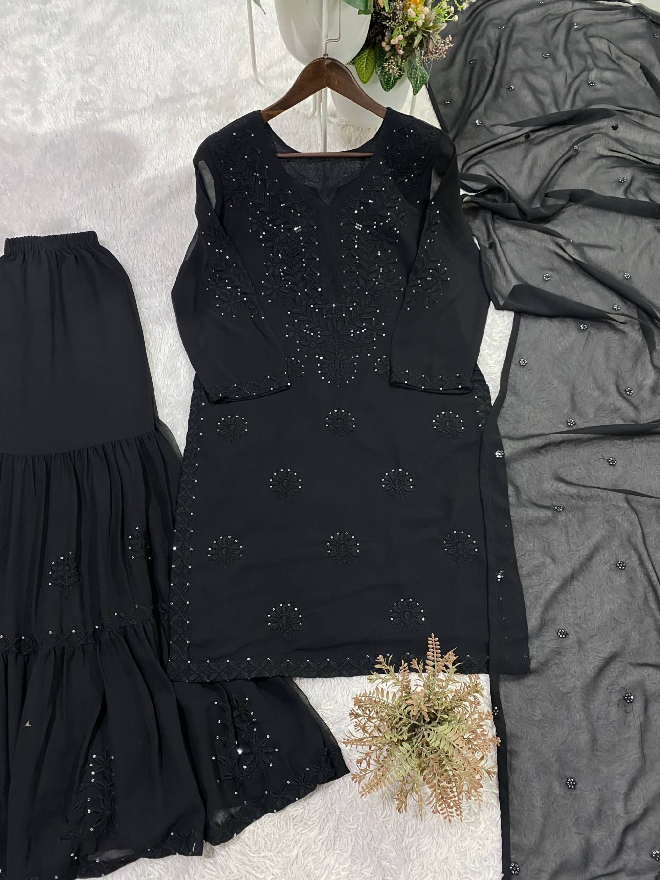 Stylish Strong Black Georgette Sequence Embroidered Top Sarara Set with Dupatta