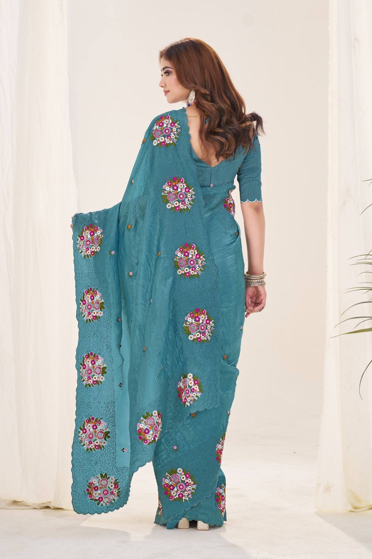 Stylish Teal Blue Gold Crush Silk Saree with Embroidery Work for Weddings