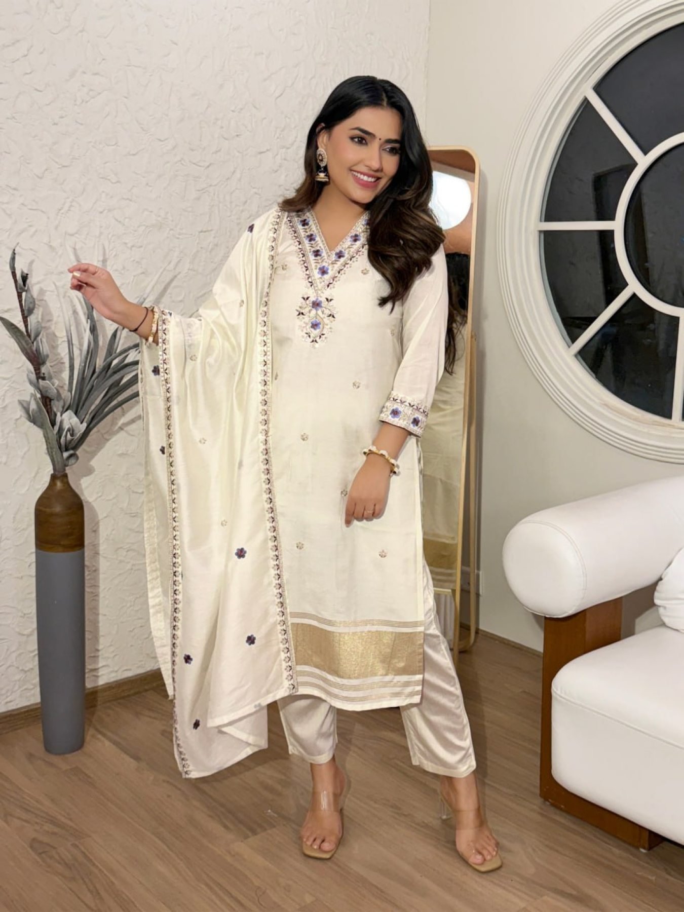 Designer Viscose Silk kurti with Viscose Chanderi pant and embroidered Chanderi cotton dupatta.