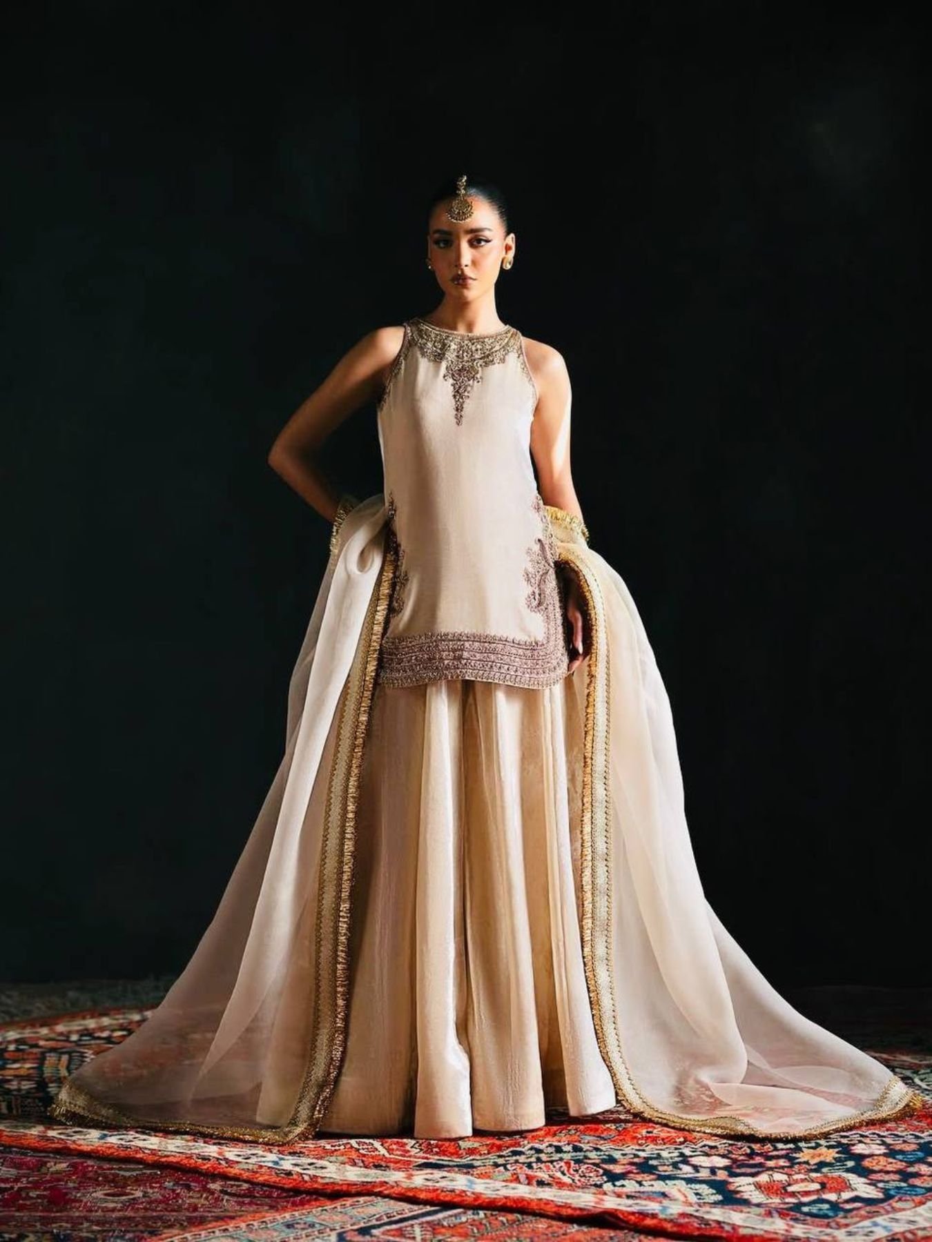 Umbrella-cut 3-meter flair palazzo adds premium volume, paired with a soft net dupatta with lace border.