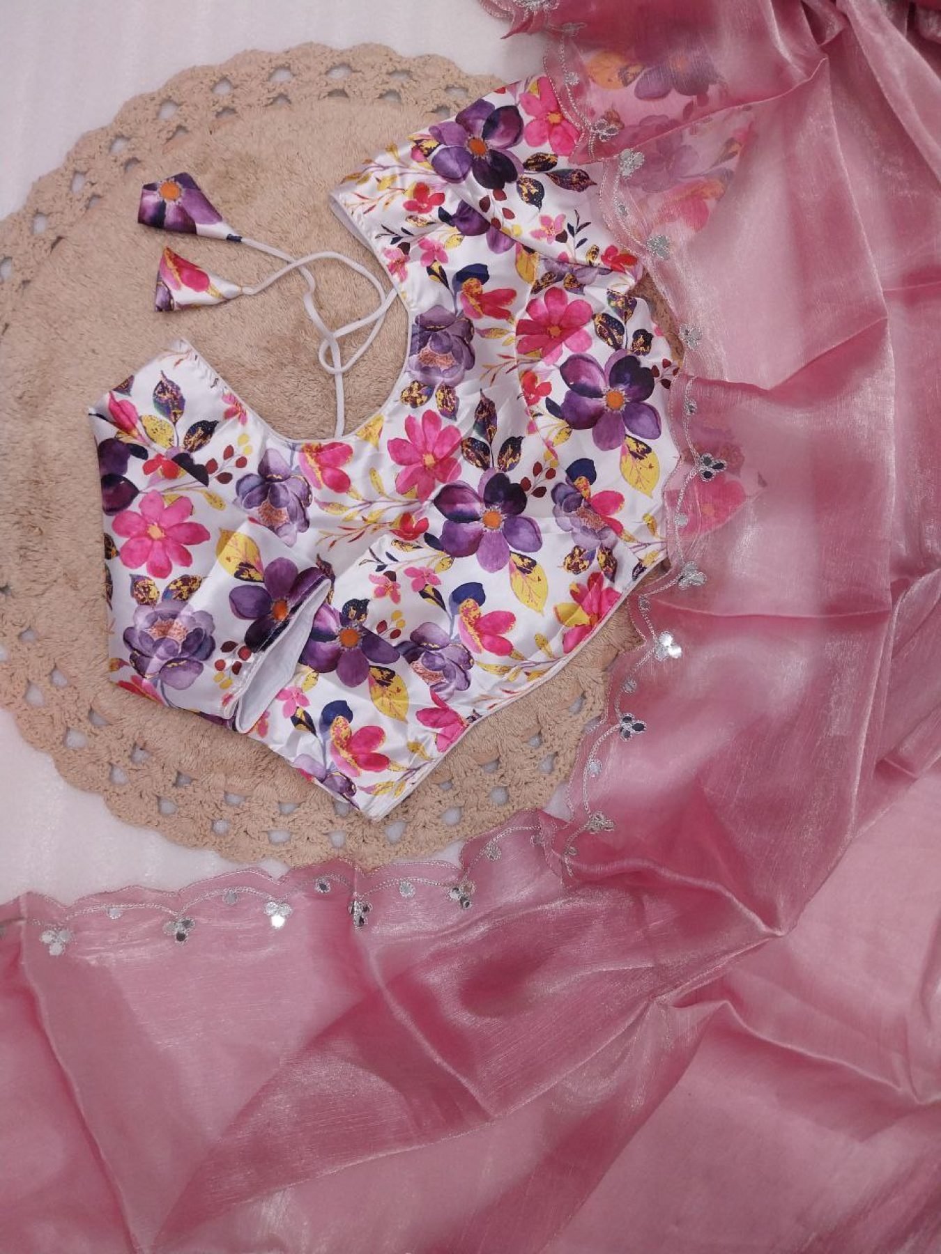 Elevate your festive wardrobe with our exclusive elegant launch – RO783, featuring a beautifully soft premium Jimmy Choo saree. This graceful drape comes adorned with intricate foil mirror aarco embroidery work across the border, making it perfect for festive occasions, weddings, or evening celebrations. It is paired with a stylish floral satin blouse in a contrasting tone to complete the look.