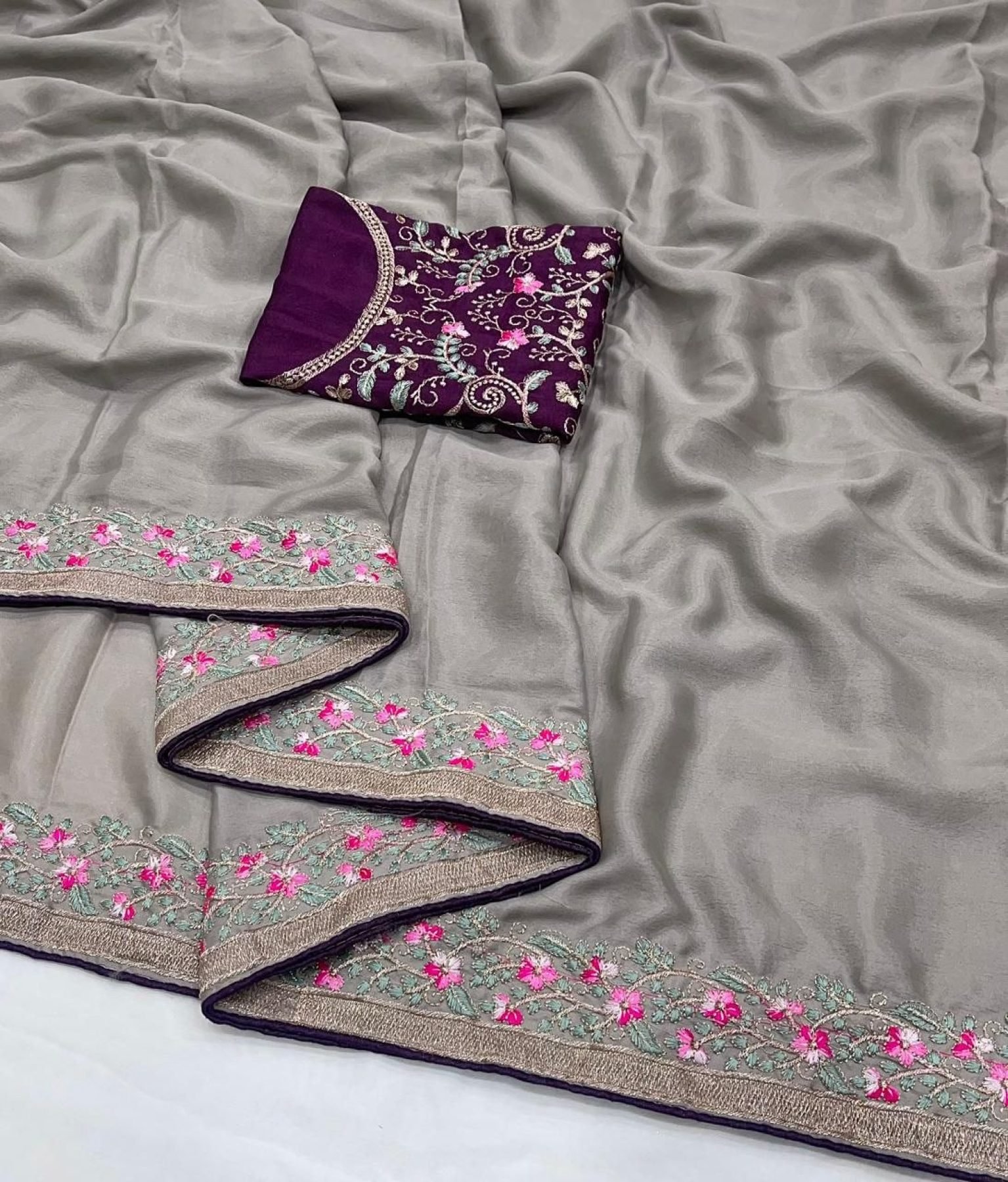 Supreme Grey Chinon Silk Saree with Embroidery Work for Party Wear