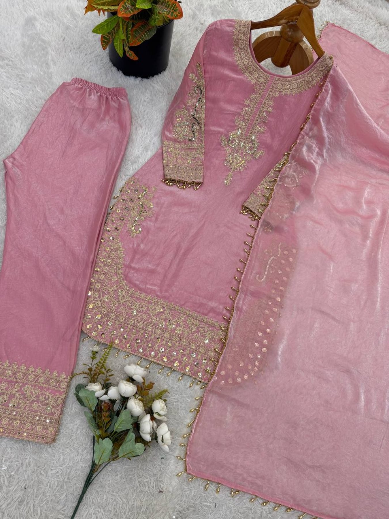 Supreme Pink Roman Glass Silk Embroidered Kurti Set with Moti Lace for Festive Wear