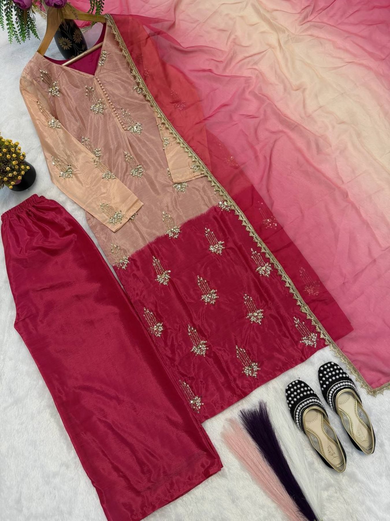 Premium chinnon silk suit set featuring real beads and moti hand work with sequins embroidery. Paired with digital print chiffon dupatta, perfect for weddings and festive occasions.
