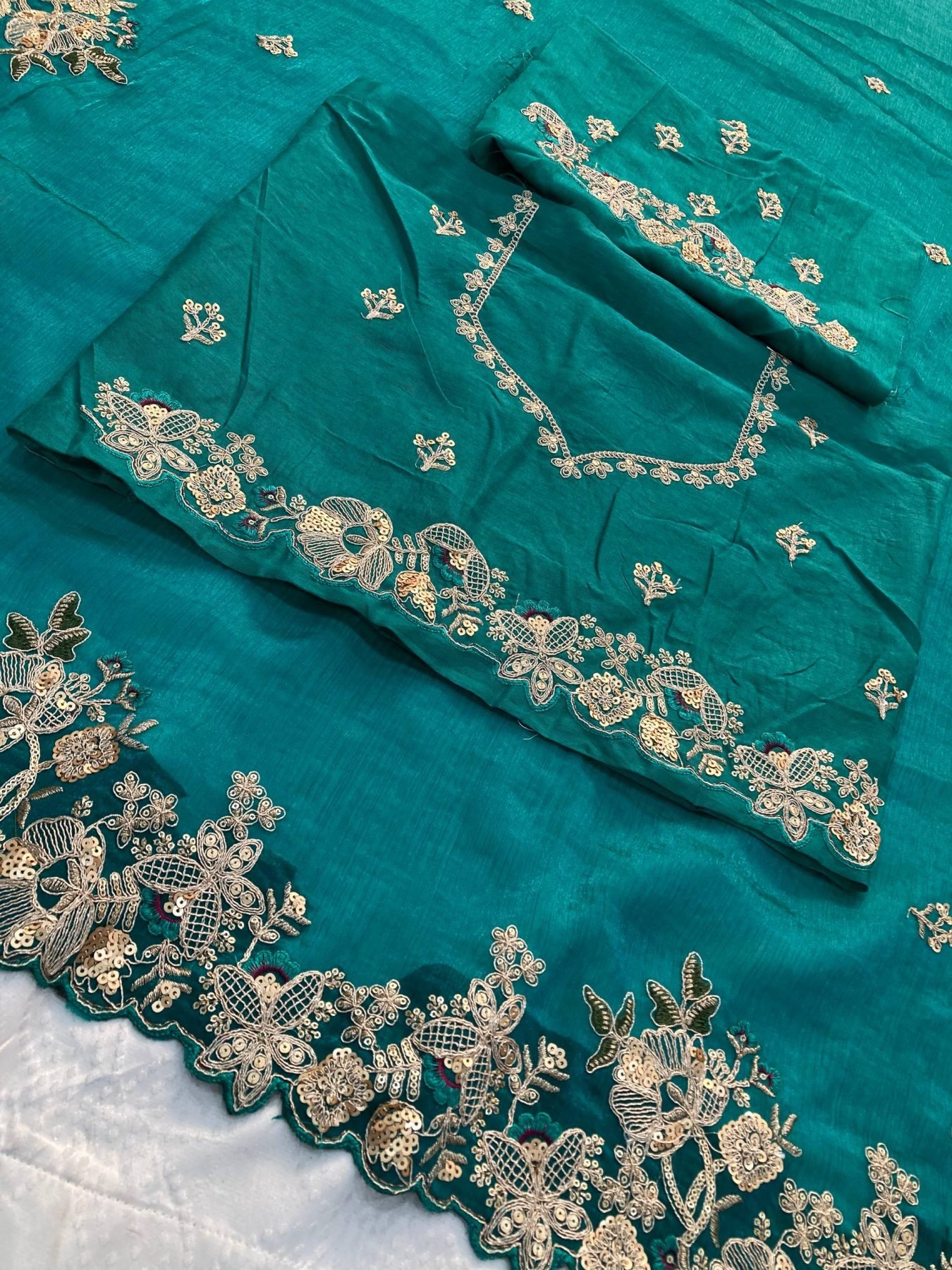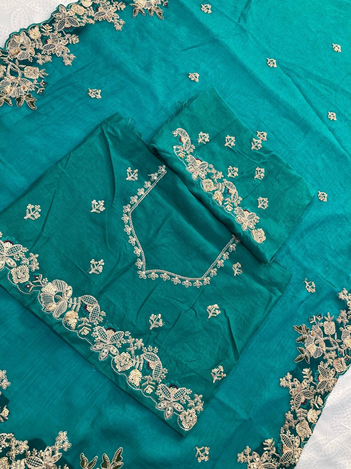Teal Fendy Chiffon Saree with Embroidery Cutwork Border and Designer Blouse at Low Price