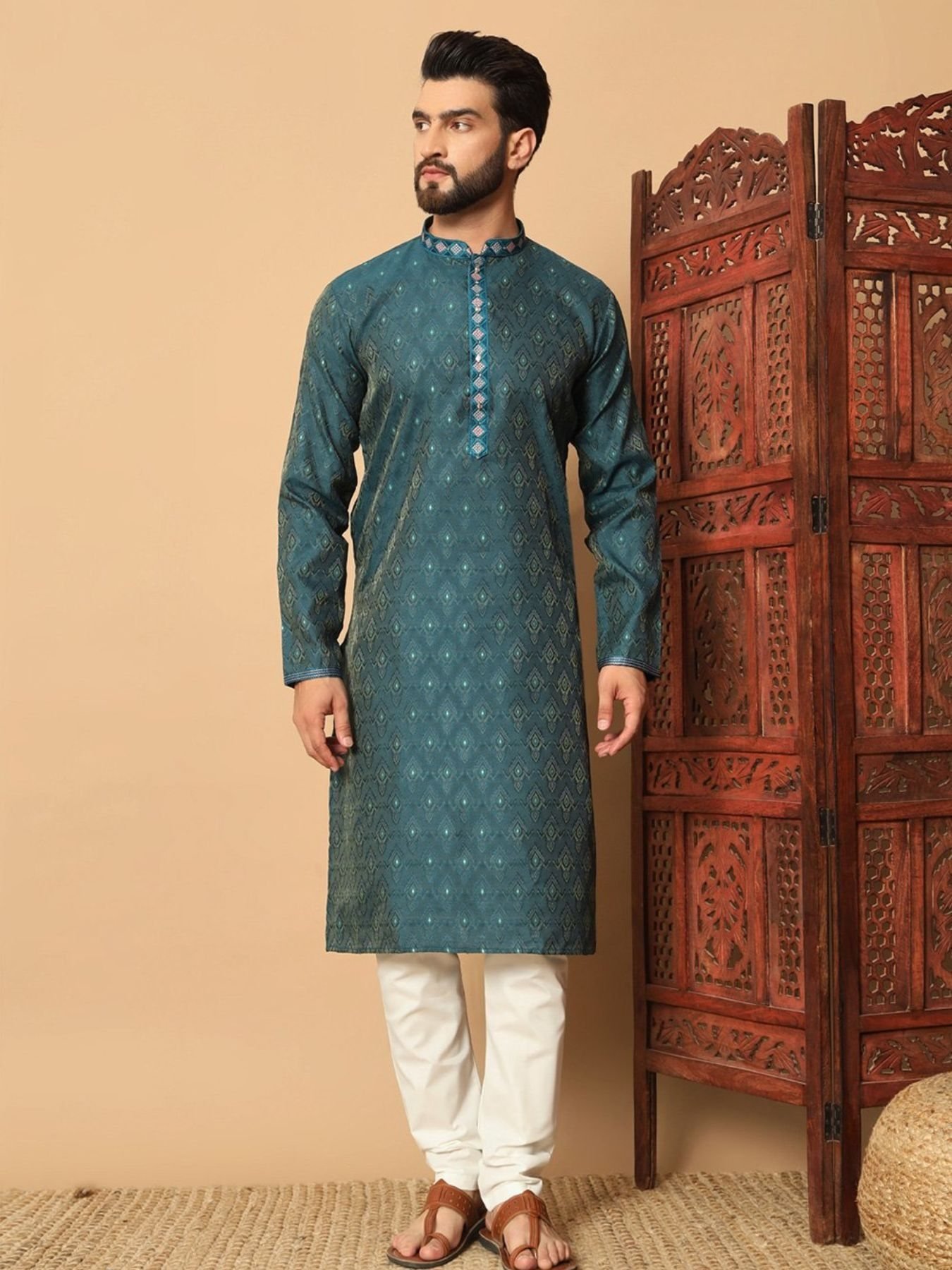 Teal Green Jacquard Weaved Thread Men's Kurta Pajama