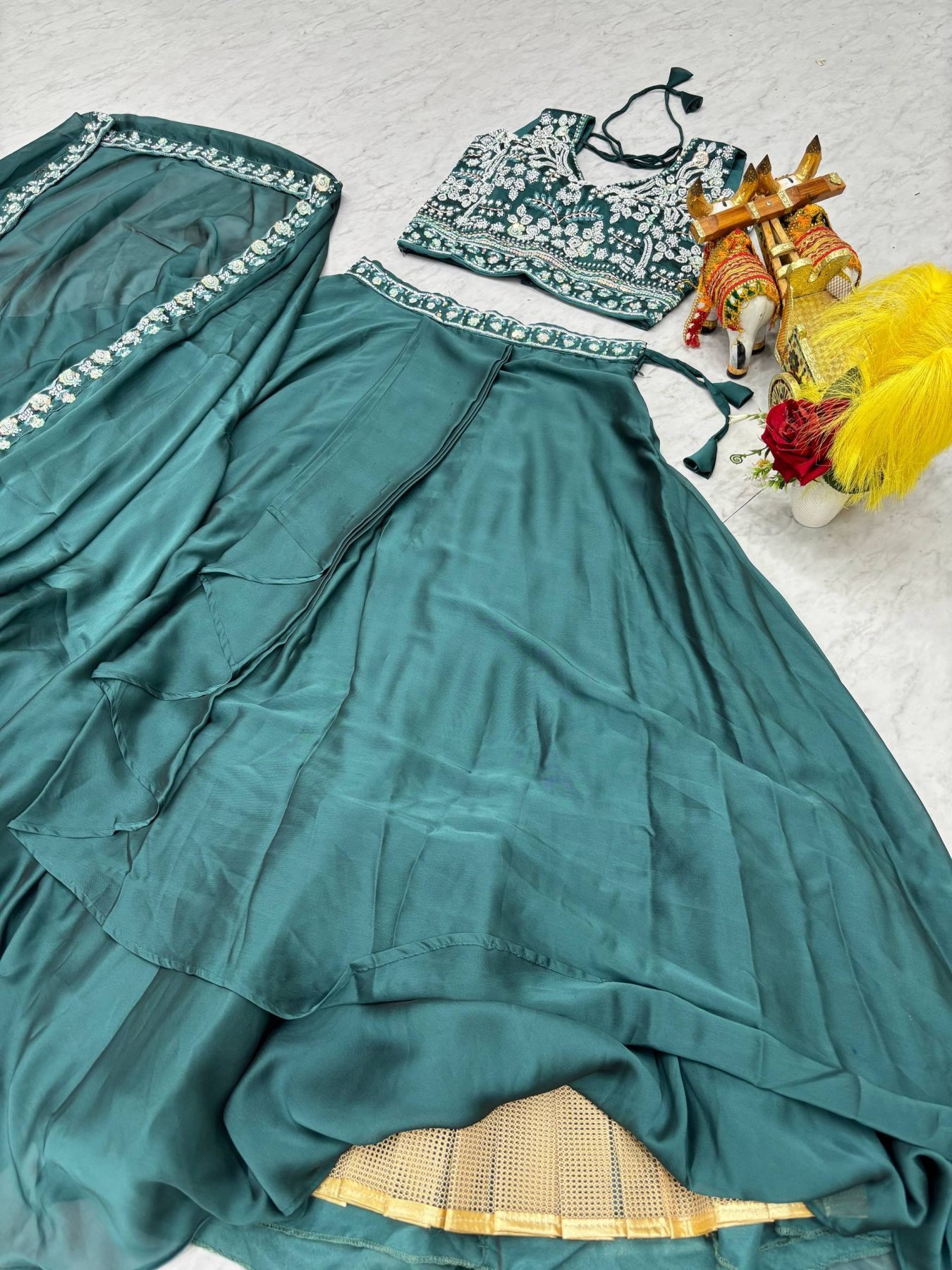 Teal Green Rangoli Silk Sequins Work Blouse with Tiered Lehenga and Shrug