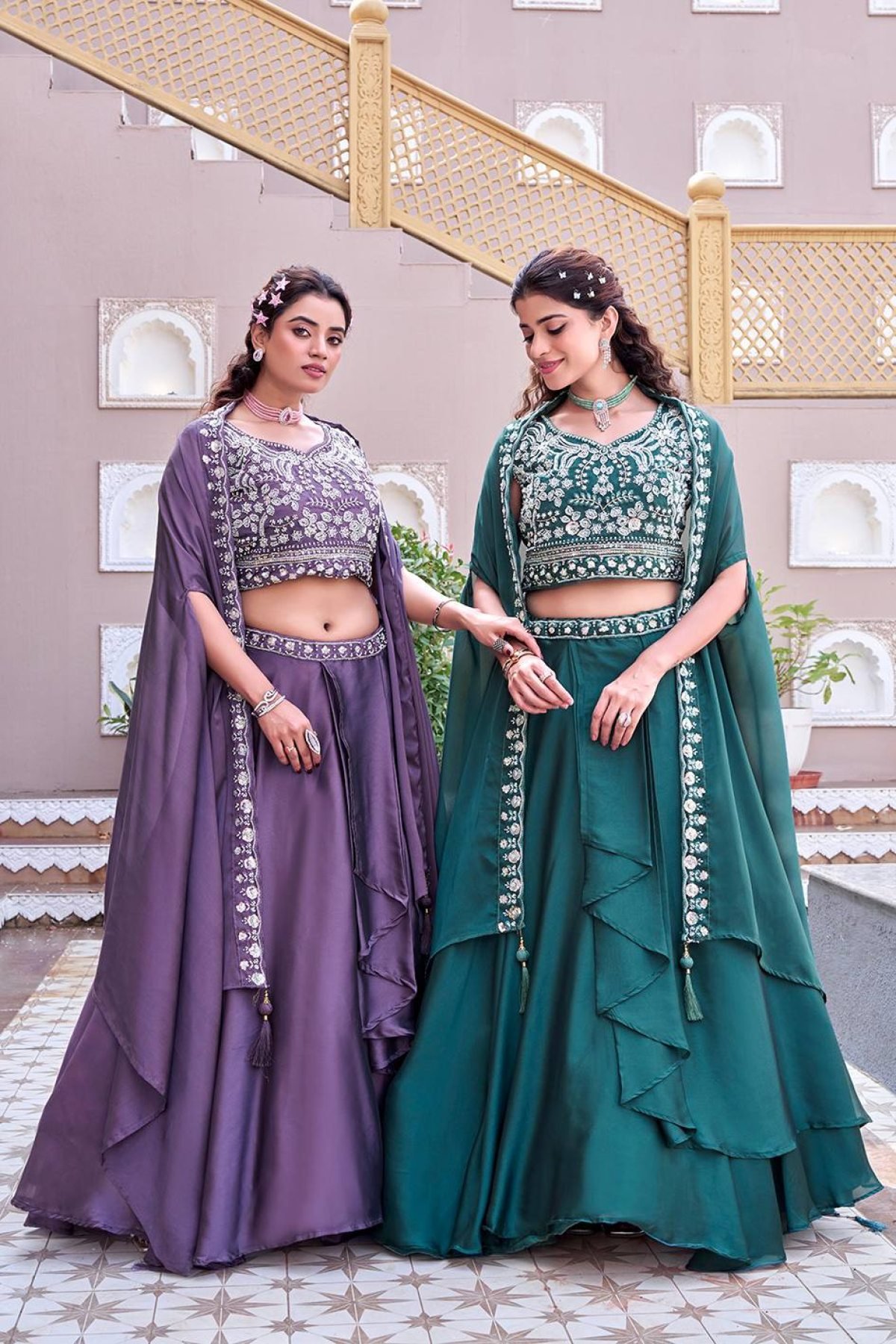 Elegant lehenga set crafted in pure Rangoli silk featuring intricate embroidery with moti beads and sequence work. Designed with a 5-meter grand flair, cancan, and canvas for a voluminous look, paired with a stylish shrug-style dupatta, perfect for weddings, festive occasions, and party wear.