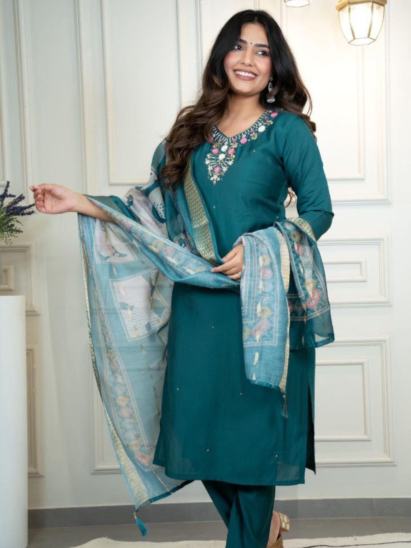 Teal Green Roman Silk Suit Set Festive Wear Collection at Best Rate