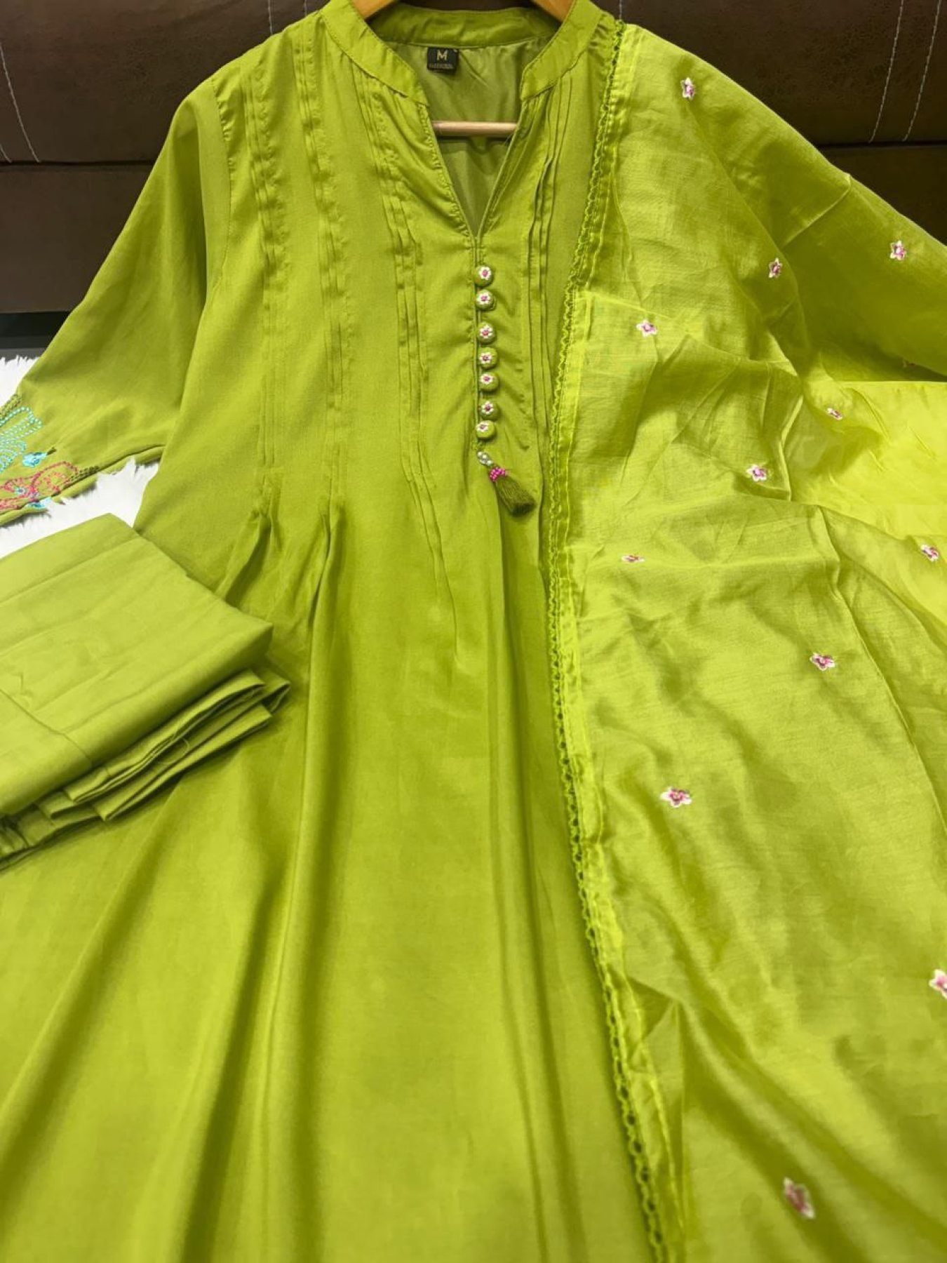 This elegant 3-piece set is crafted in premium chanderi silk, featuring attractive and gorgeous embroidery work that gives a rich festive appeal. Paired with a matching chanderi silk dupatta, this outfit is ideal for festive wear, parties, and boutique collections.