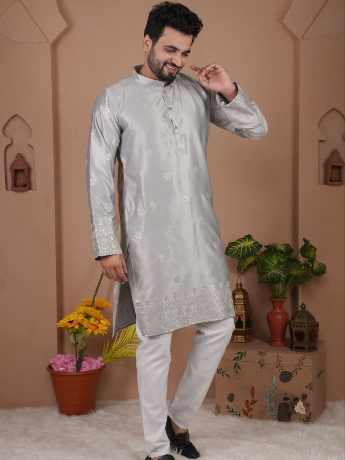 Stylish men’s kurta set in malai silk fabric with heavy embroidery and sequins work, paired with matching pyjama. Perfect for festive and wedding occasions.