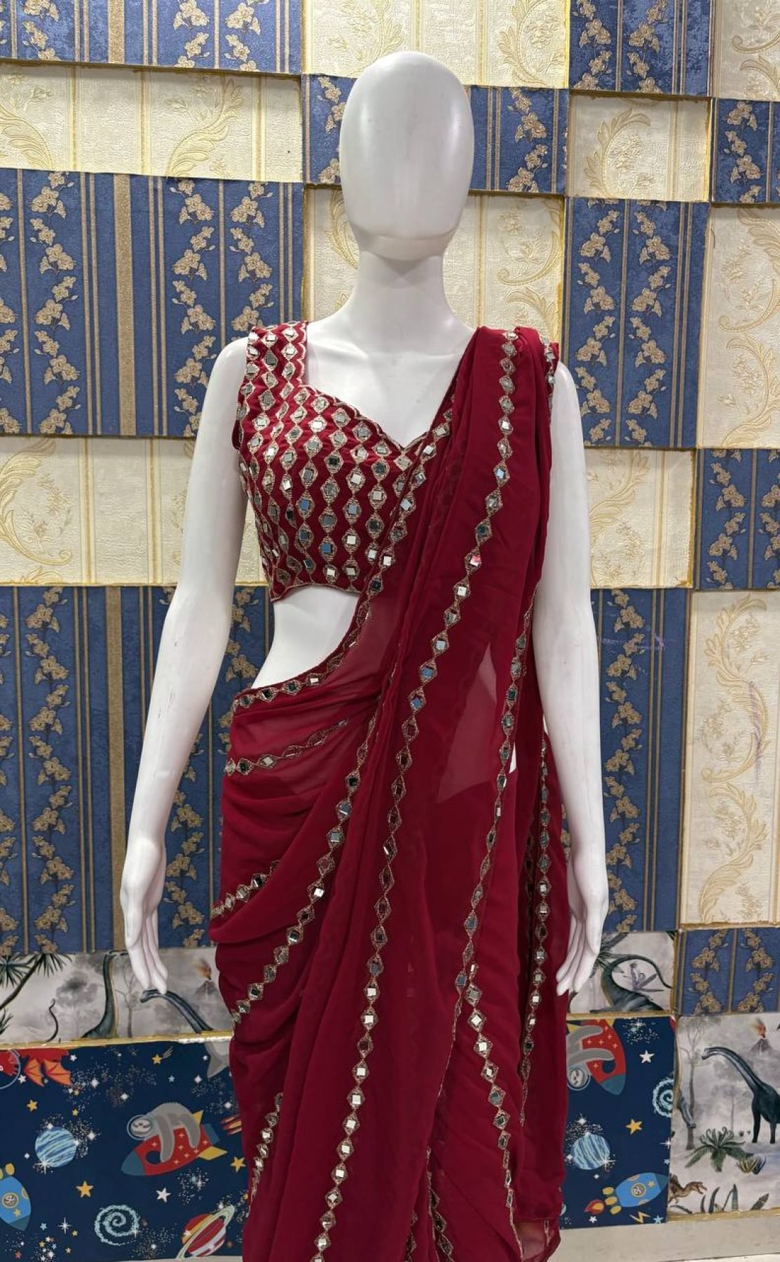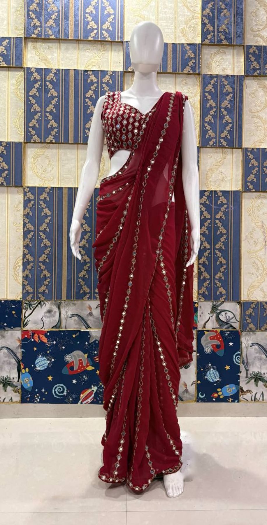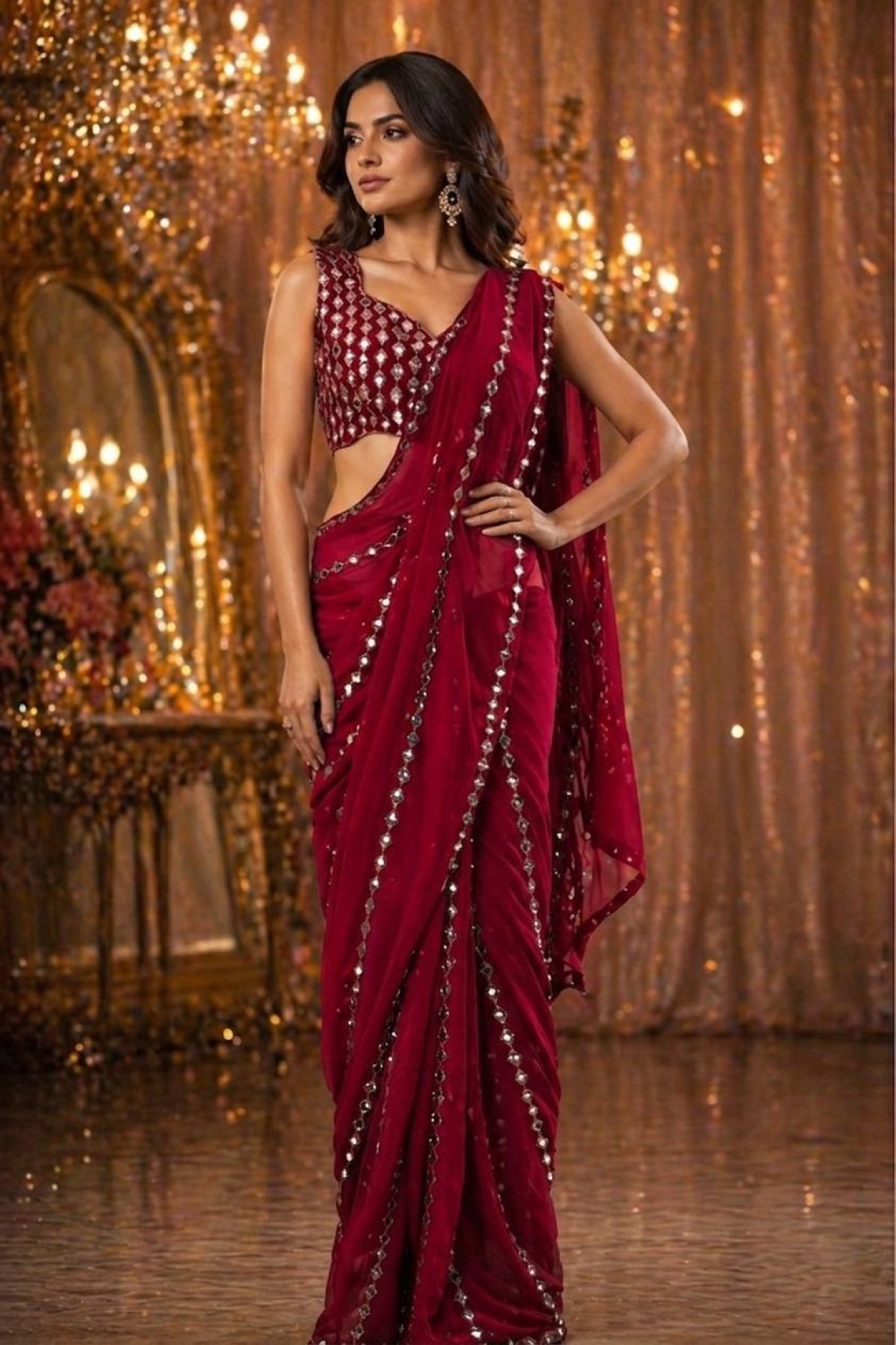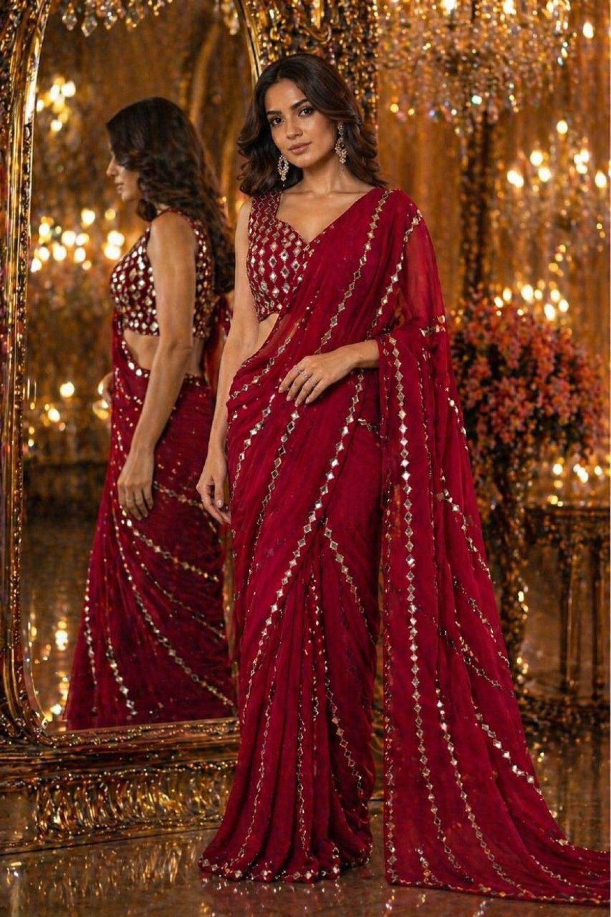 Premium faux georgette saree featuring embroidery with real mirror work paired with matching blouse. Perfect for festive, party and wedding occasions.