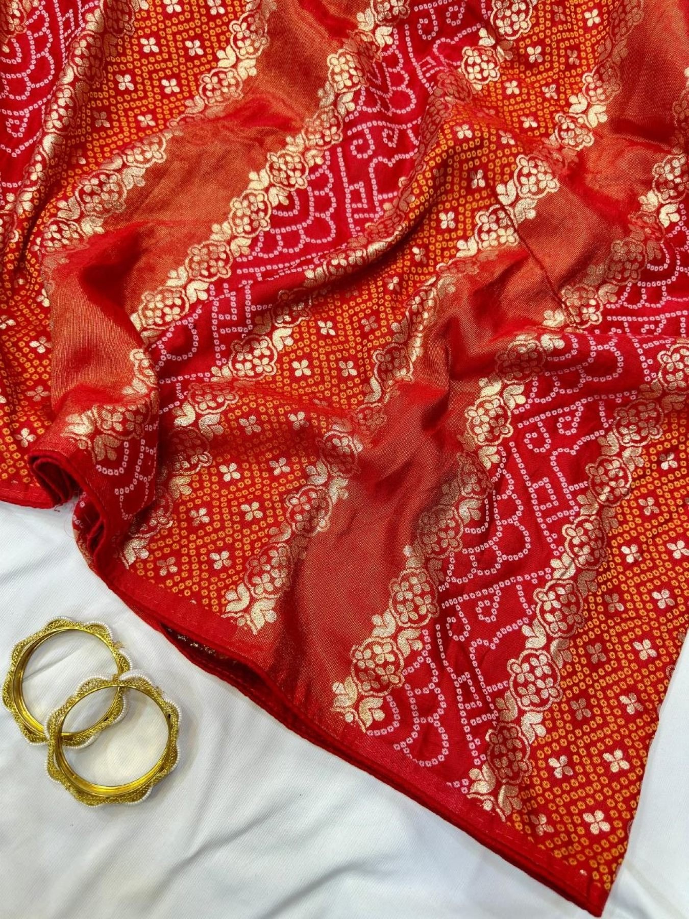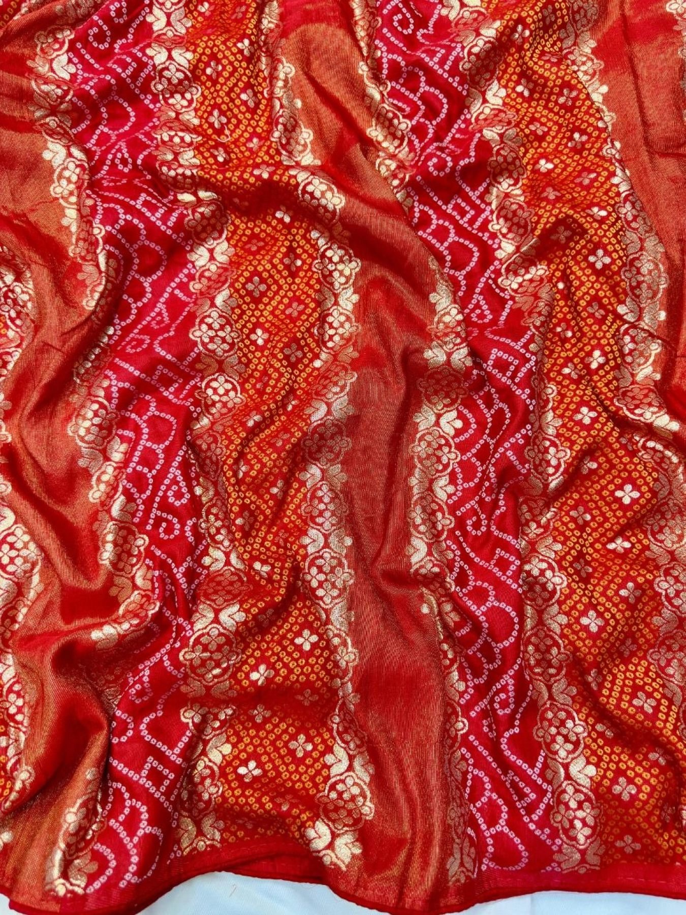 Premium dola silk bandhani saree with zari fusion weaving, heavy Jaipuri pallu, and all-over butti design. Comes with contrast blouse for a rich traditional look.