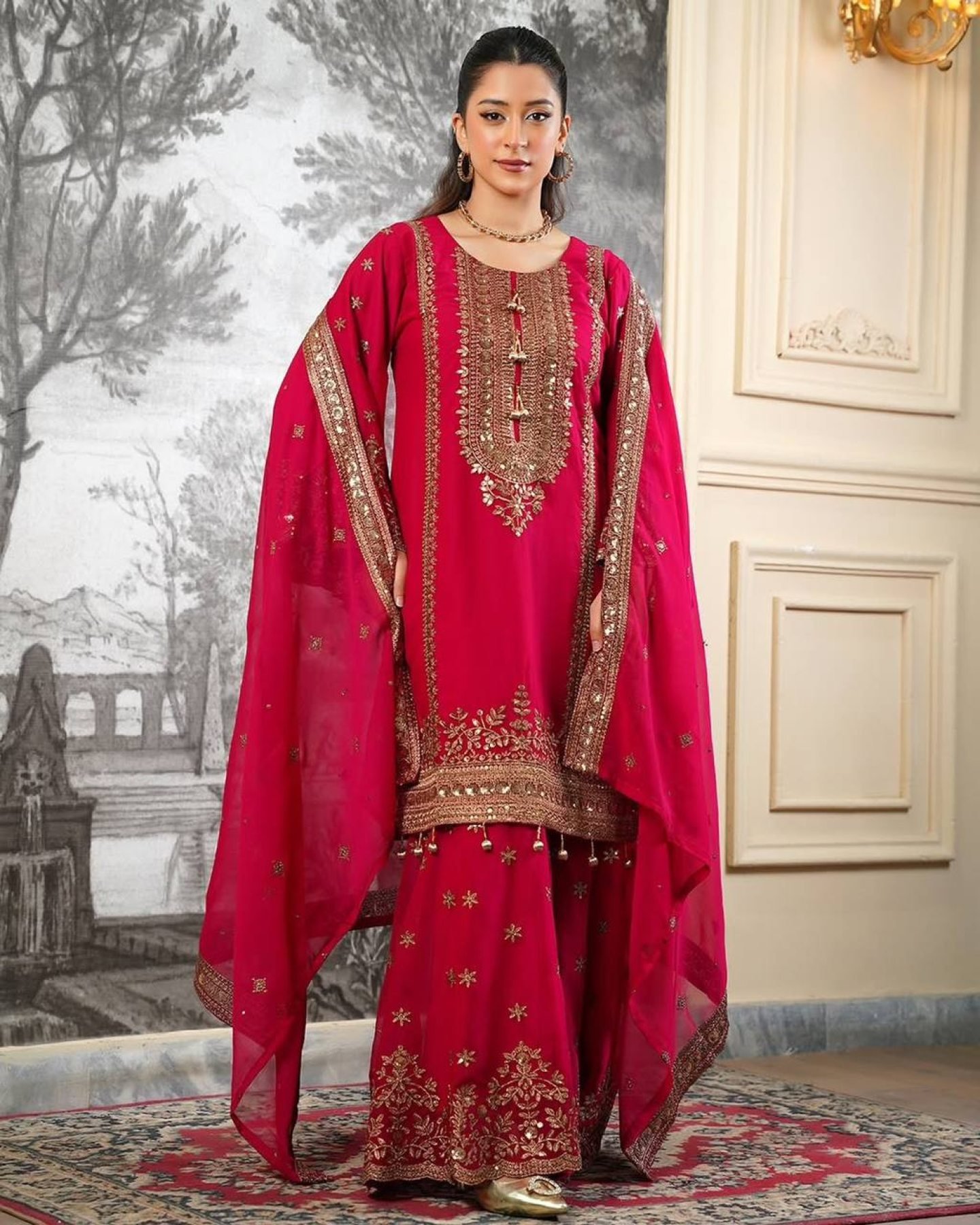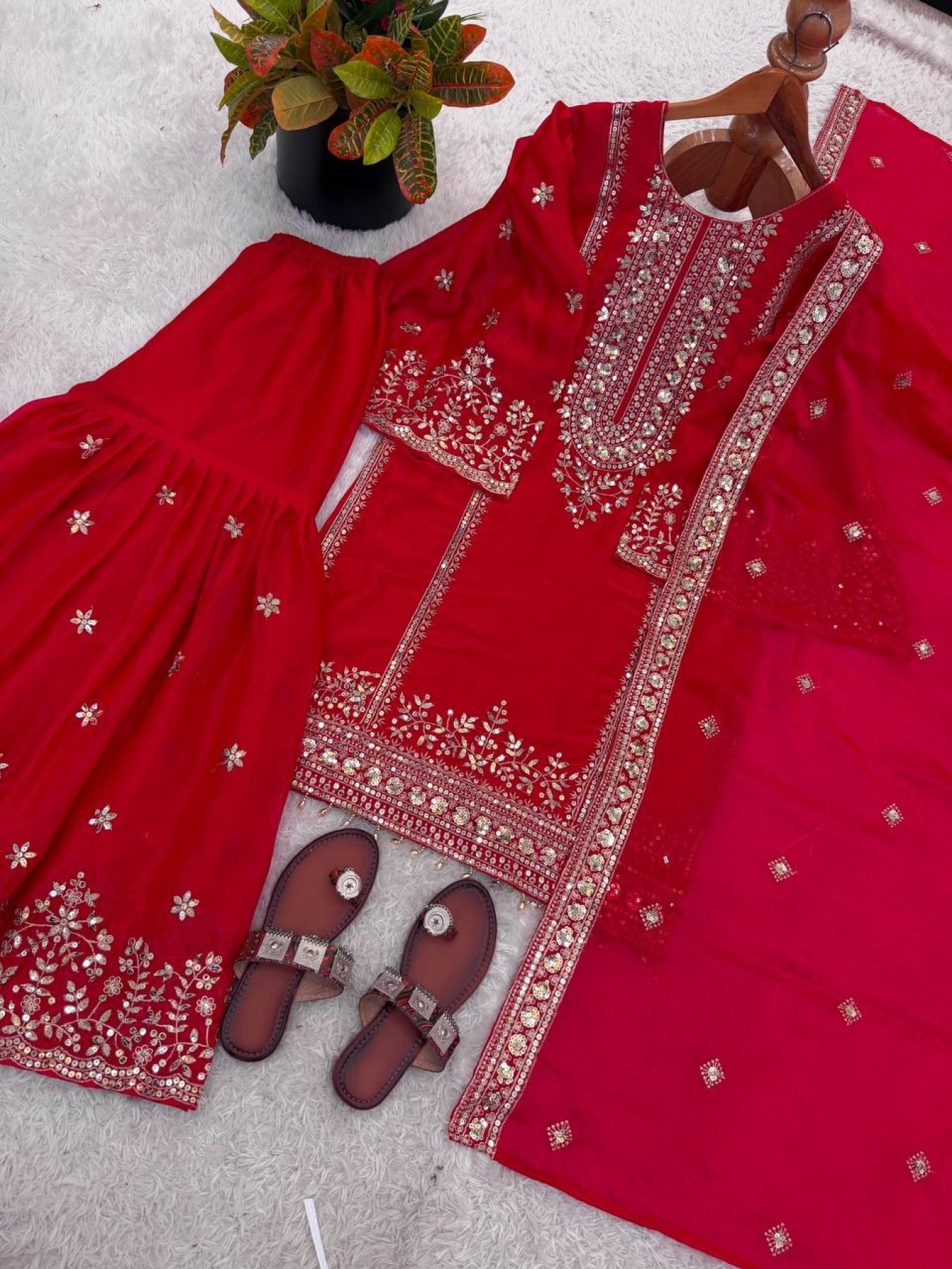 Traditional Red Hand-Embroidered Silk Sharara Suit for Weddings And Festivals
