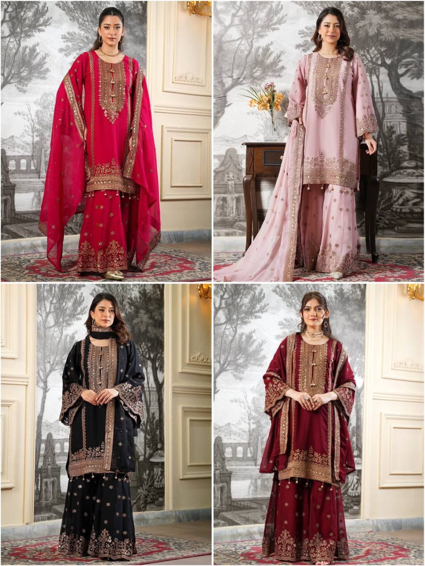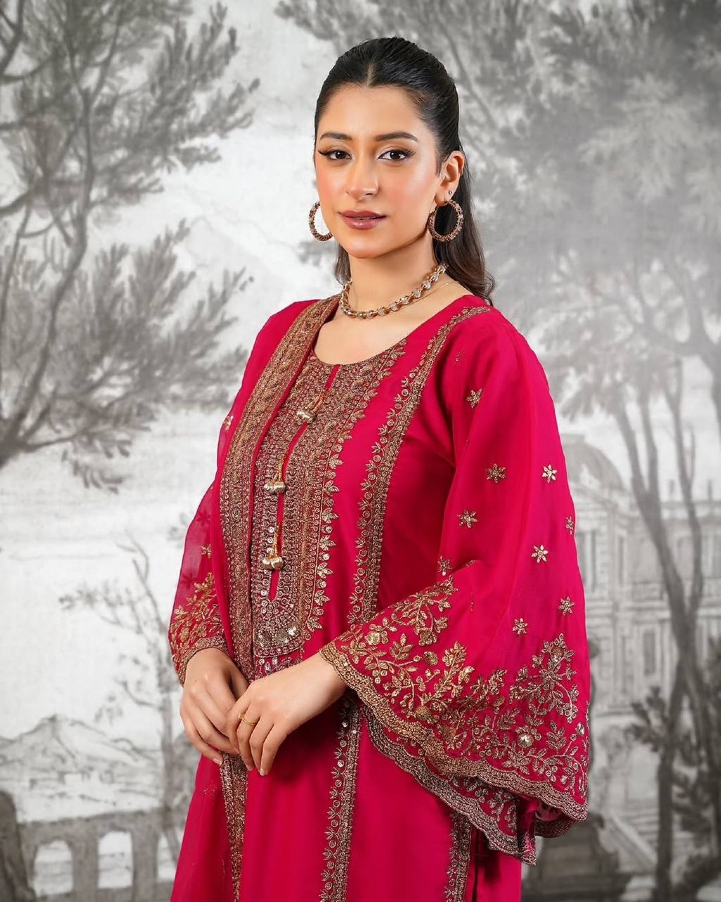 Premium fendy silk sharara suit set featuring heavy embroidery sequence work with elegant lace detailing, paired with full flair sharara and matching dupatta. Perfect for wedding, festive, and party wear with a luxurious ethnic look.