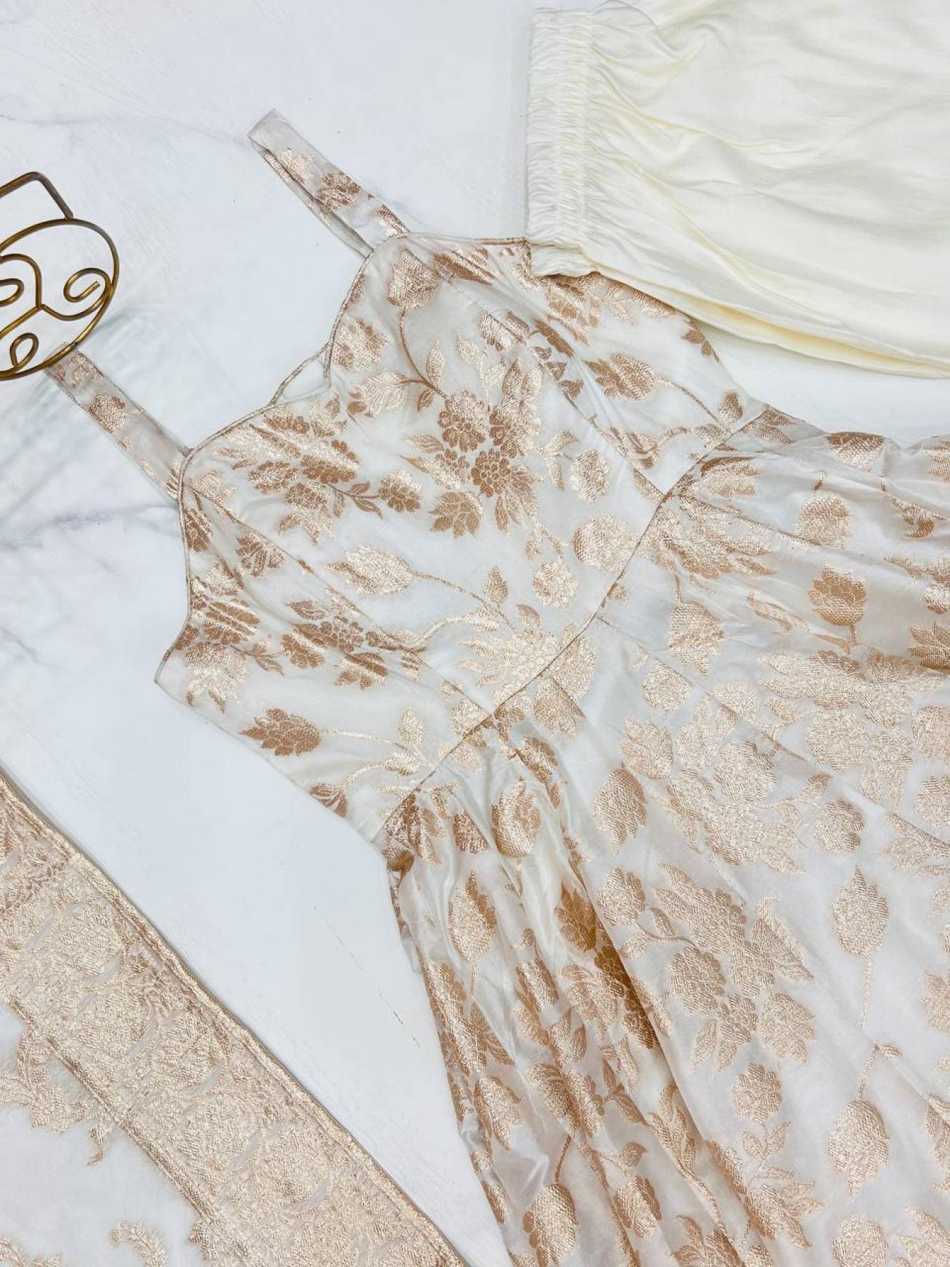 Traditional White Color Banarasi Dola Silk Anarkali Kurti Set With 4 Meter Flare At Manufacturer Price