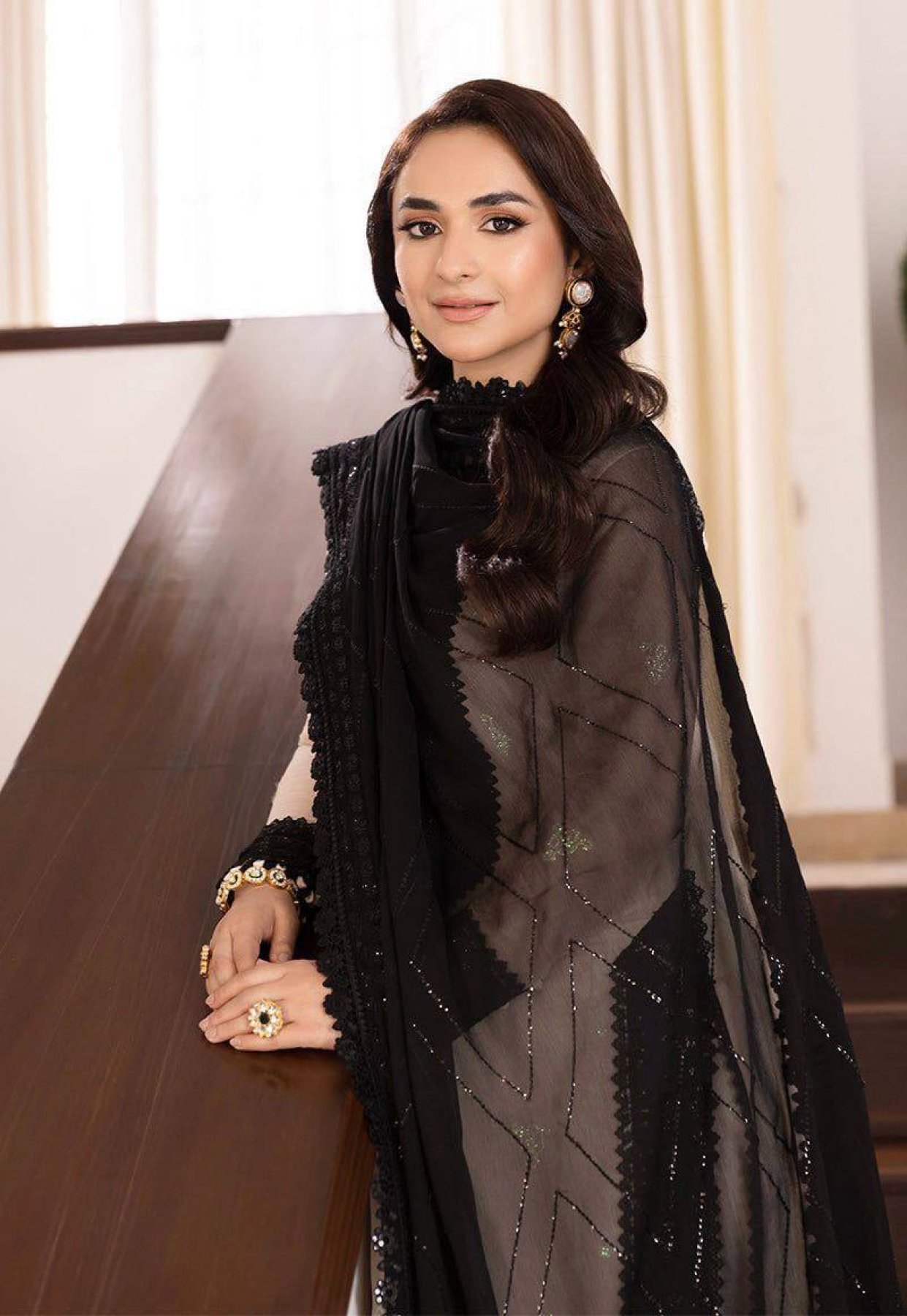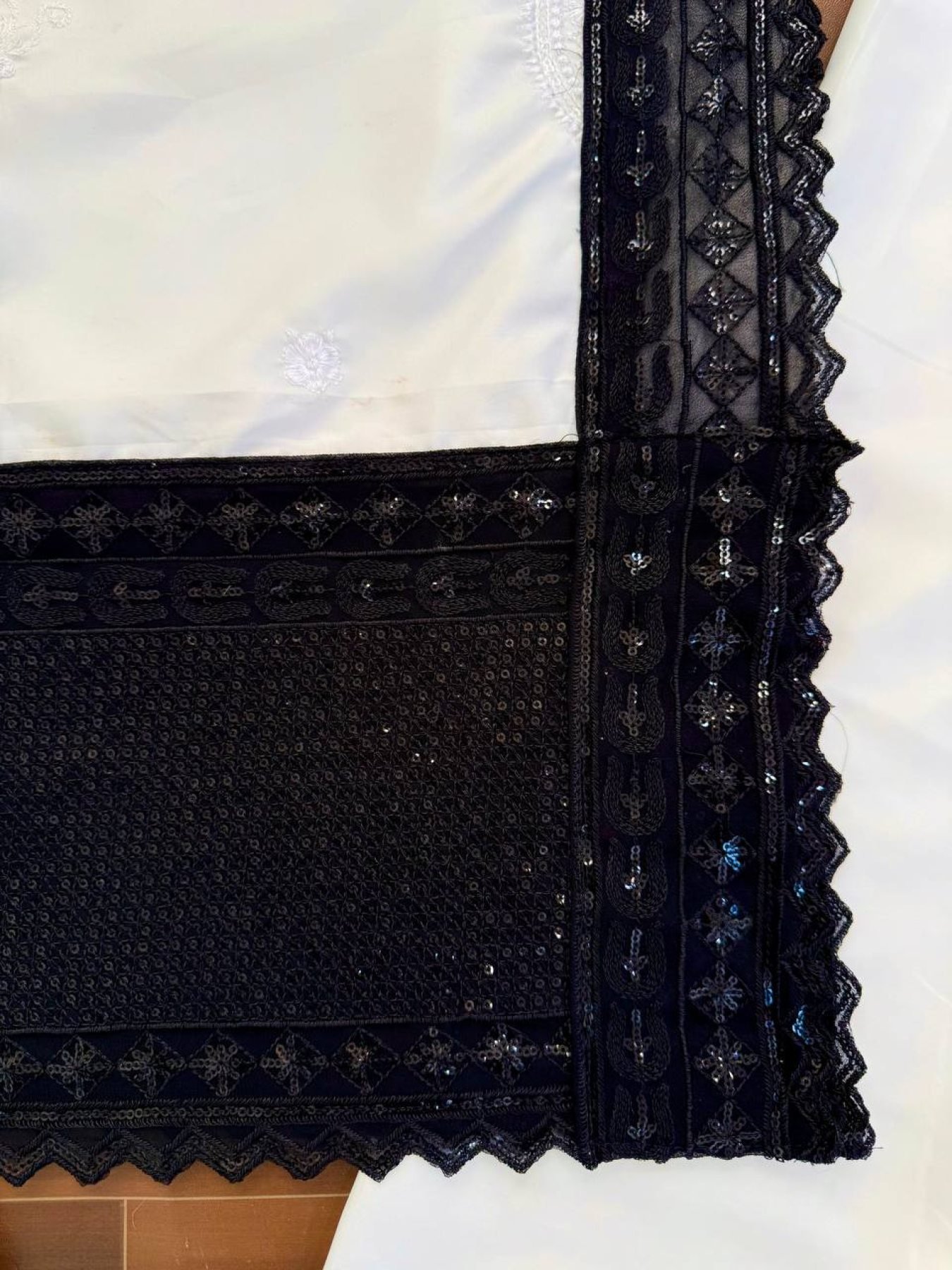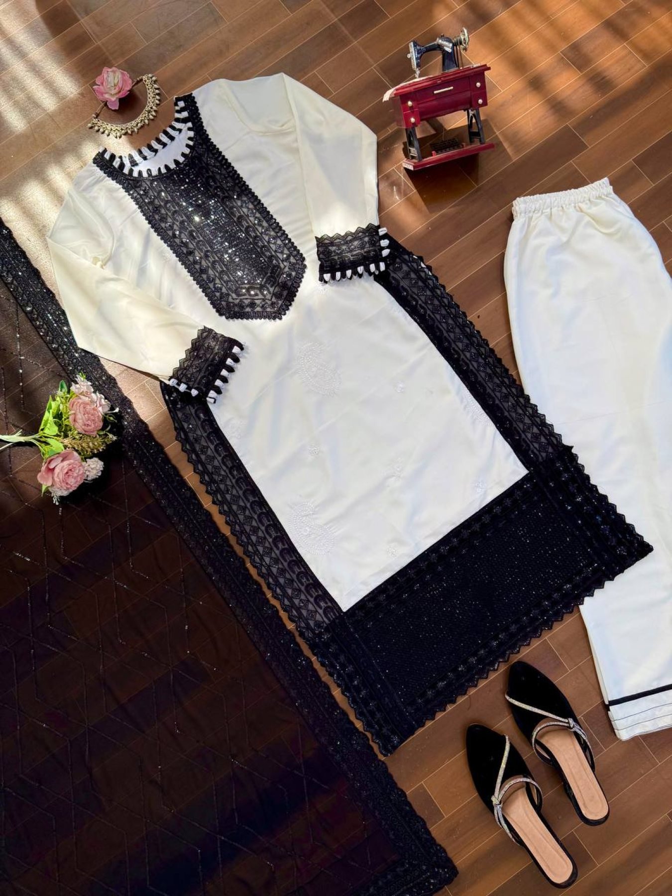 Elegant top pant set crafted in heavy natural crepe featuring intricate thread and sequence work. Paired with lace work pants and a beautifully designed faux georgette dupatta, perfect for festive wear and special occasions.
