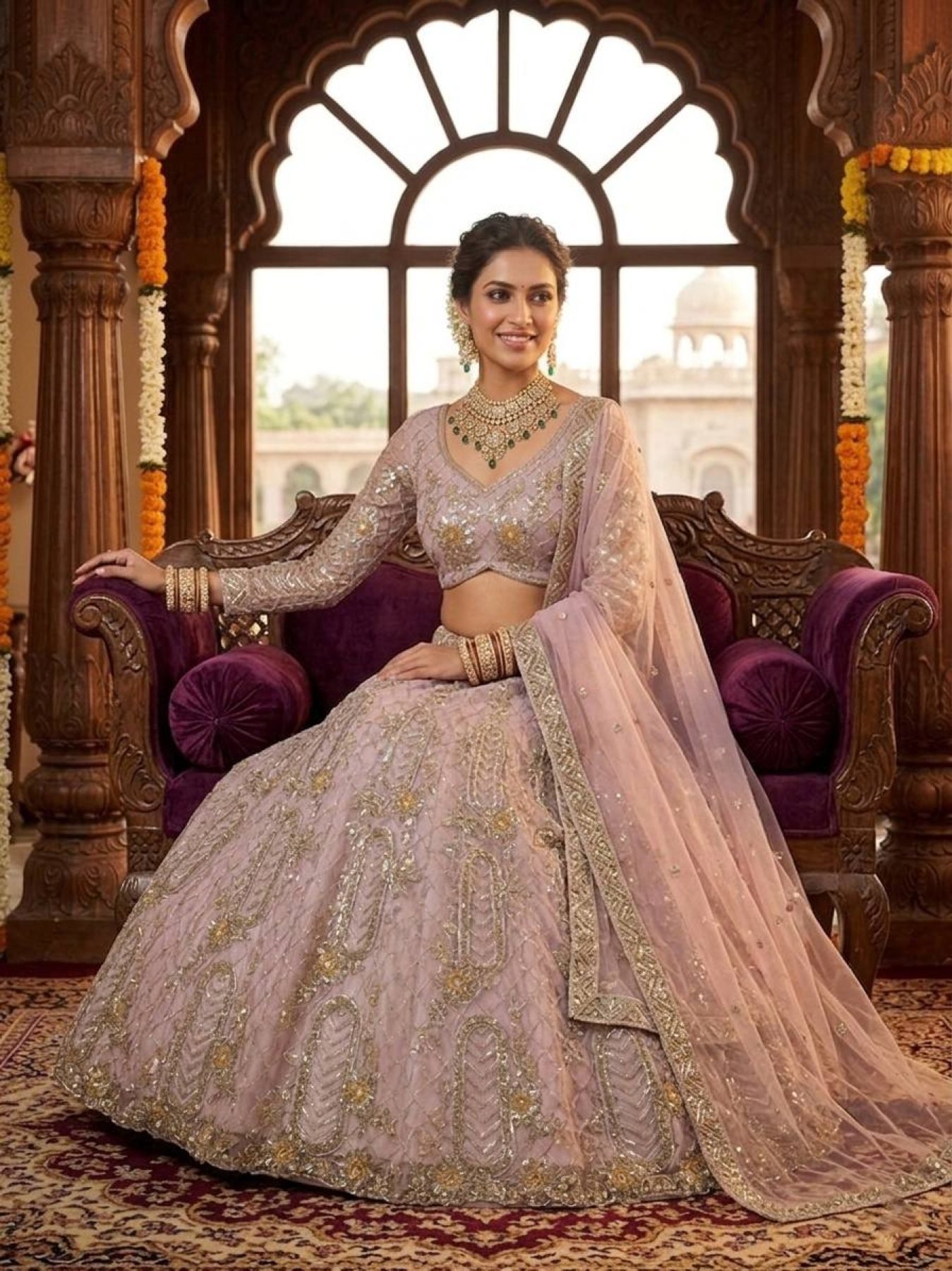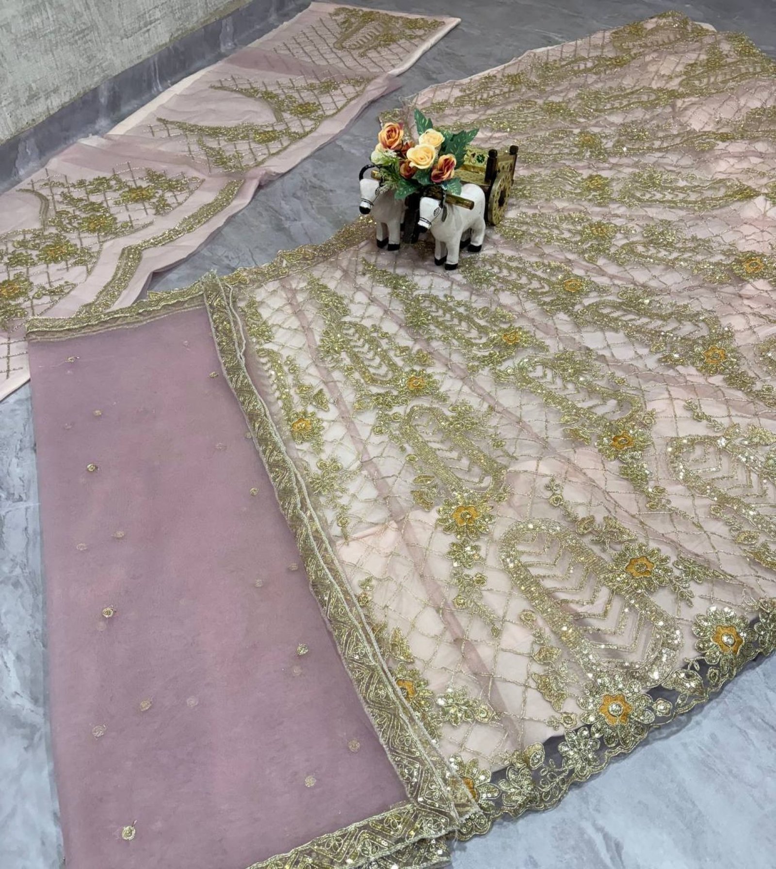 Premium soft net lehenga set crafted with elegant coding sequins work and rich 4 meter flare. Enhanced with can-can and canvas layers for grand volume, paired with matching blouse and dupatta for perfect wedding and festive wear.