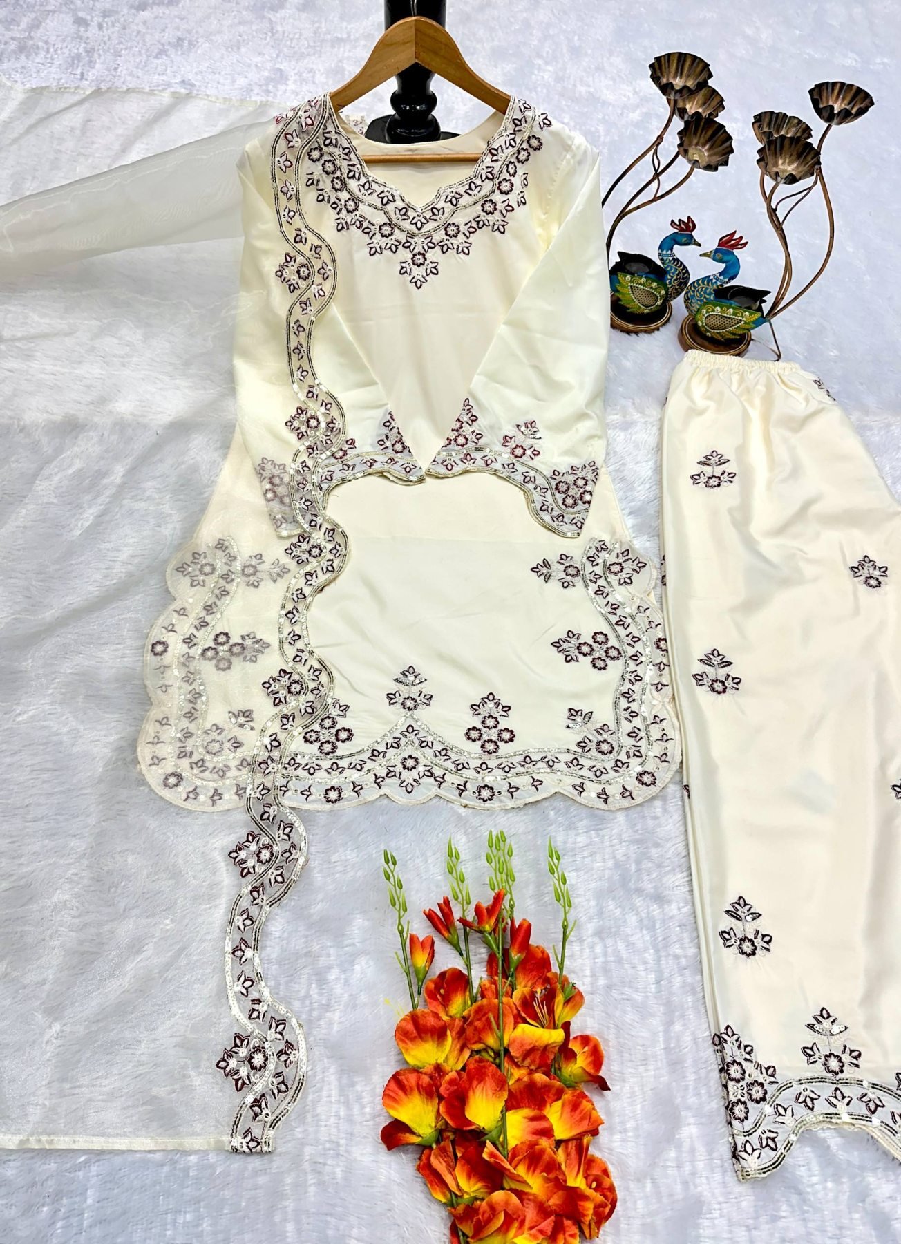 Premium natural crepe suit set featuring heavy embroidery and cut work on top, paired with embroidered plazzo and rich organza silk dupatta. Perfect for wedding, festive, and party wear with a stylish designer look.