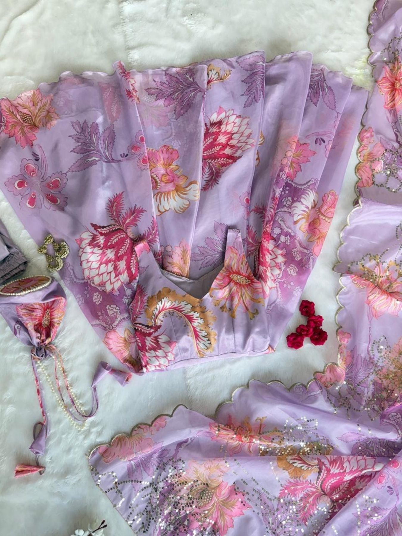 Trendsetting Lavender Floral Print Organza Silk Gown with Batwa Bag at Manufacturer Rate