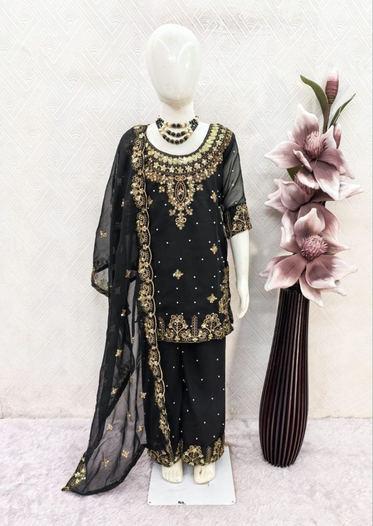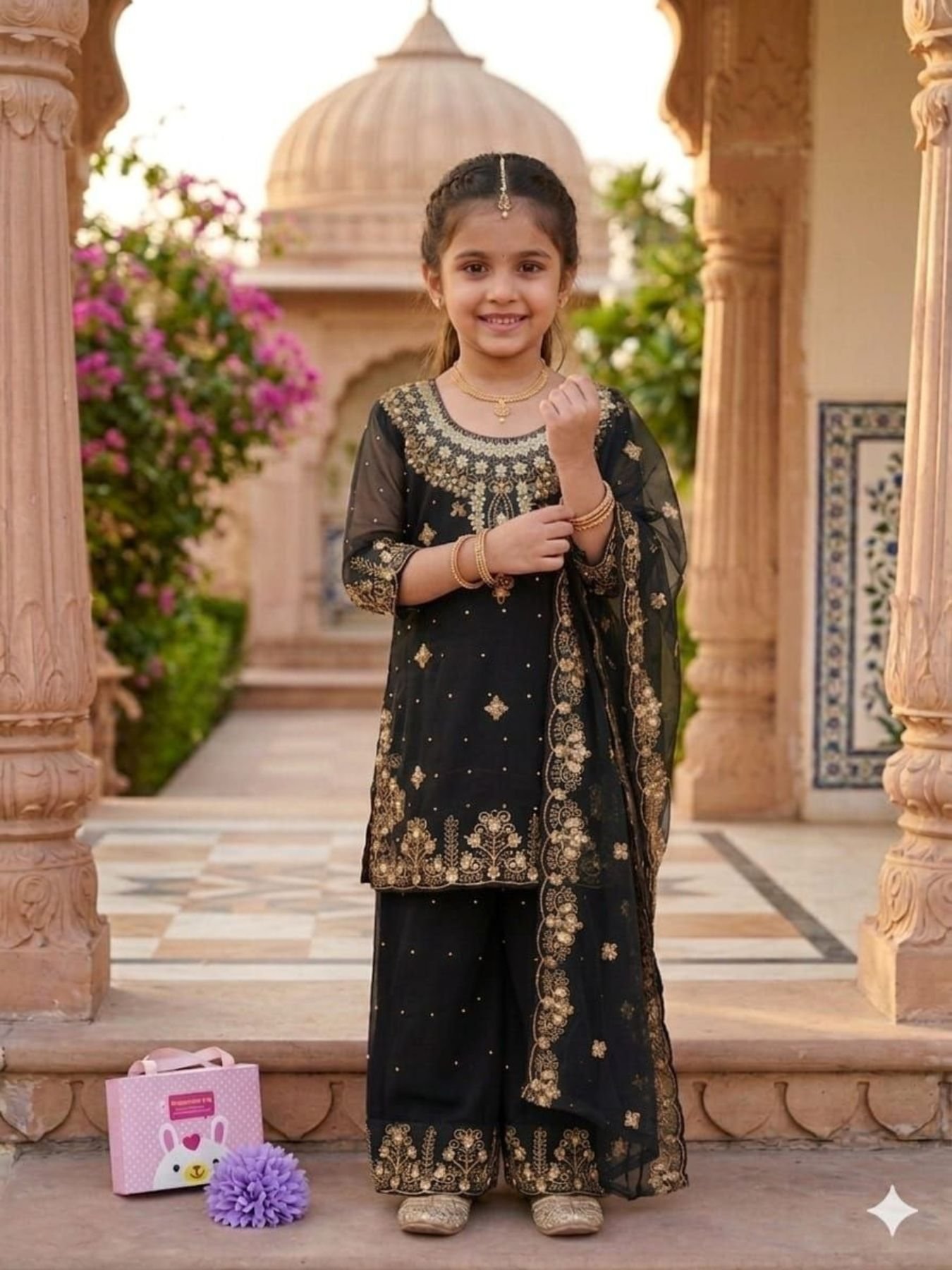 Beautiful kids kurti sharara set crafted in georgette featuring rich multi embroidery with moti work. Designed with soft lining and elegant dupatta, this outfit is perfect for festive occasions and celebrations.